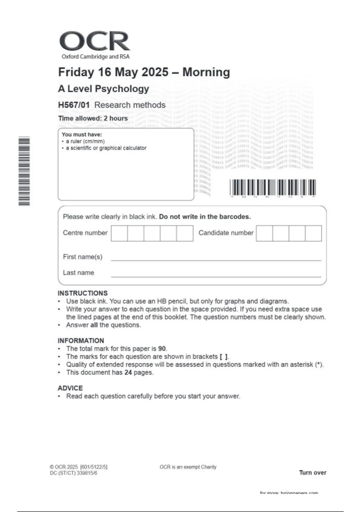 OCR GCE Psychology H567/01: Research methods A Level Question paper and Mark Scheme for June 2025