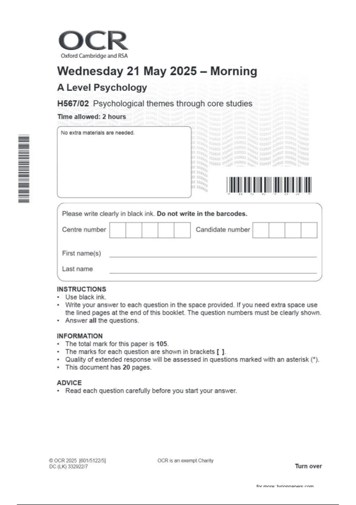 OCR GCE Psychology H567/02: Psychological themes through core studies A Level Question paper and Mark Scheme for June 2025