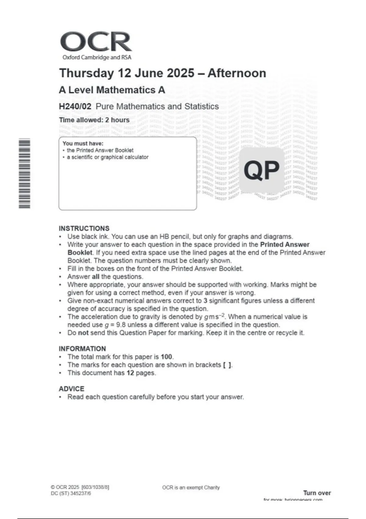 OCR A Level Mathematics A H240/02 Pure Mathematics and Statistics June 2025