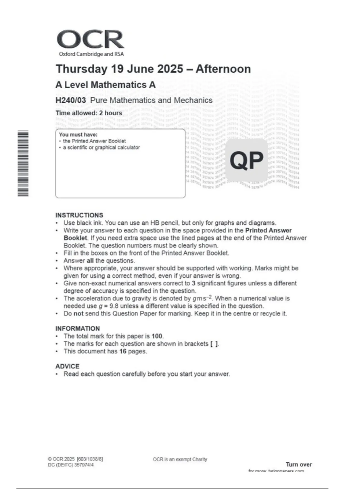 OCR A Level Mathematics A H240/03 Pure Mathematics and Mechanics June 2025