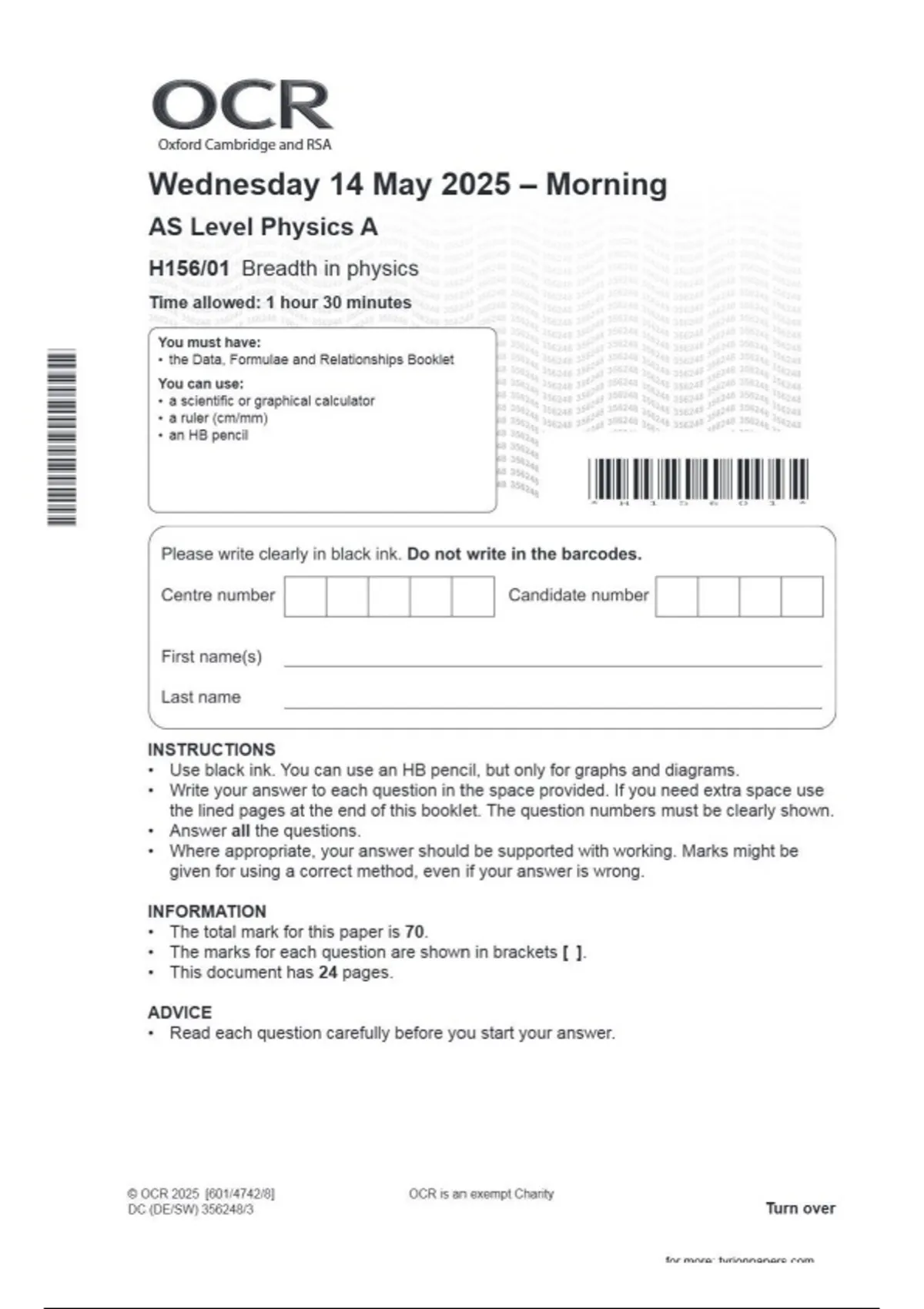 OCR AS Level Physics A H156/01 Breadth in physics June 2025