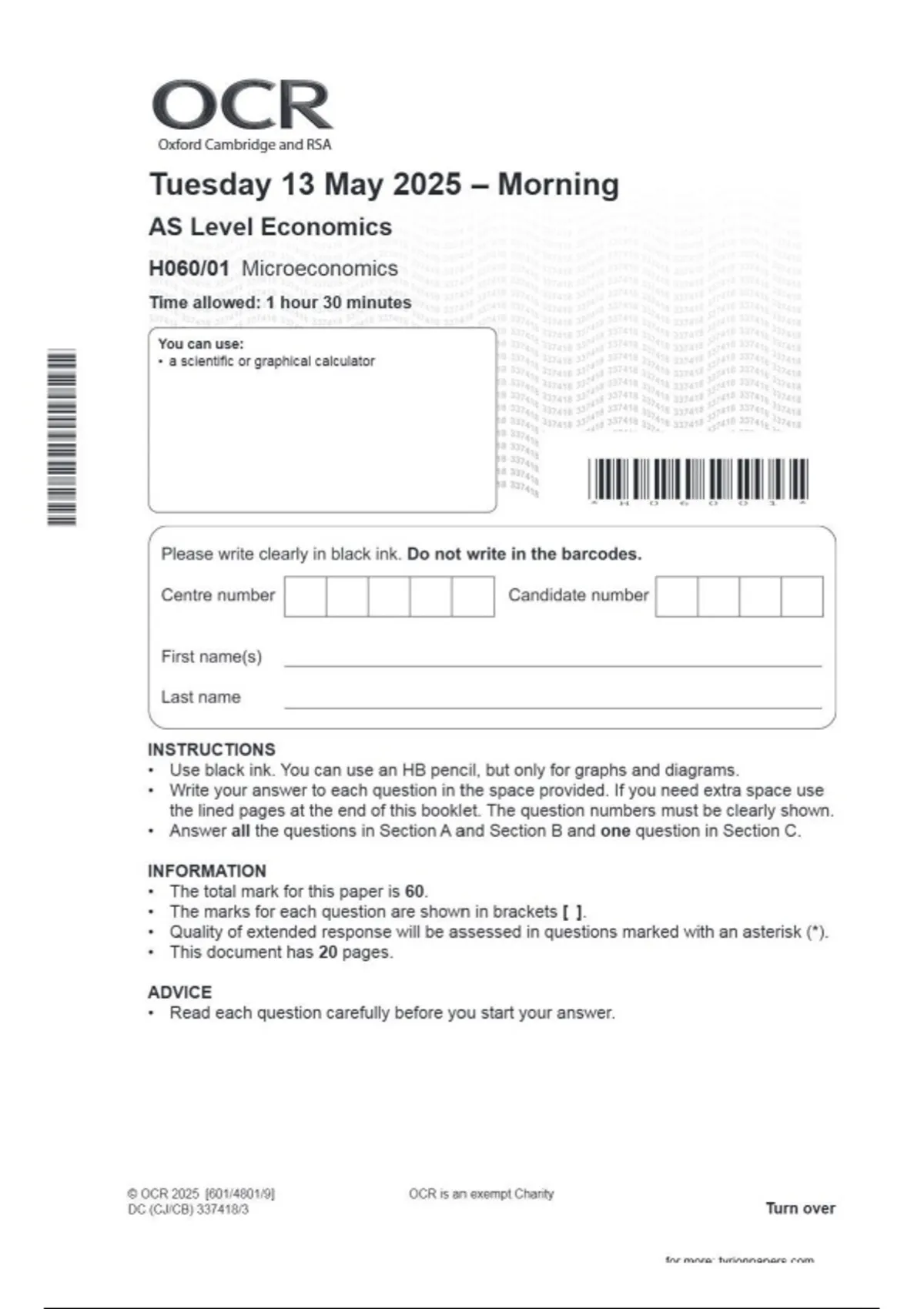 OCR AS Level Economics H060/01 Microeconomics June 2025