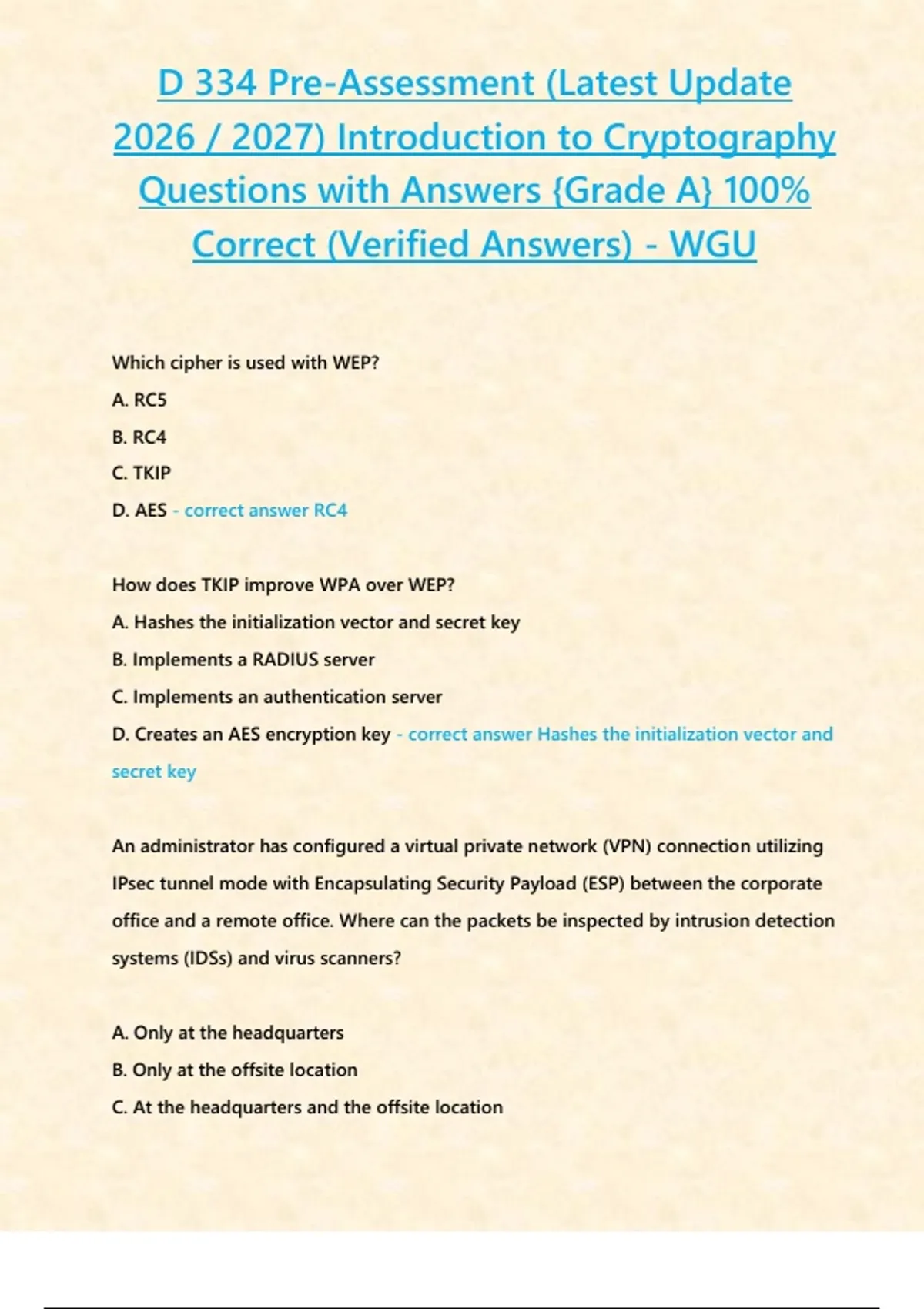 D 334 Pre-Assessment (Latest Update 2026 / 2027 STUDY BUNDLE PACKAGE WITH SOLUTIONS) Introduction to Cryptography Questions with Answers {Grade A} 100% Correct (Verified Answers) - WGU
