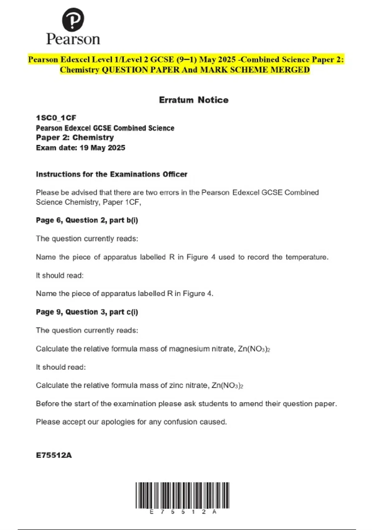 Pearson Edexcel Level 1/Level 2 GCSE (9–1) May 2025 -Combined Science Paper 2: Chemistry QUESTION PAPER And MARK SCHEME MERGED