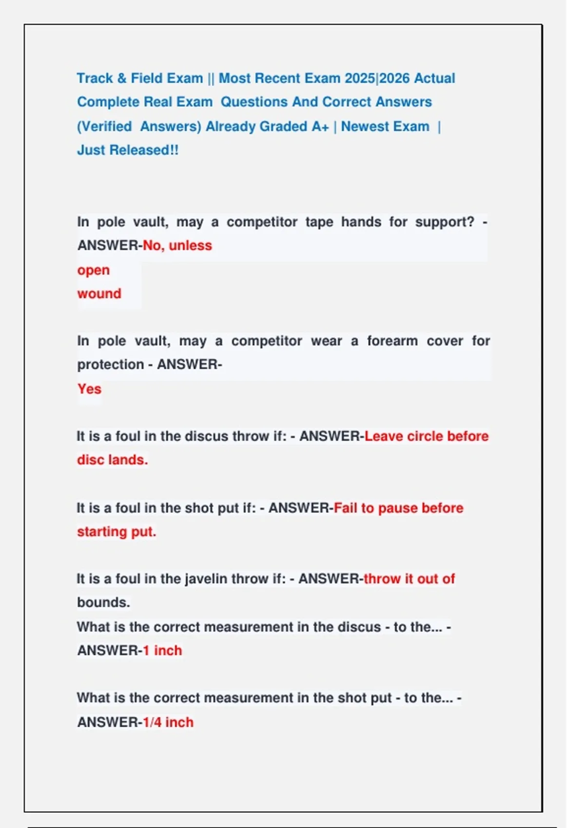 Track & Field EXAM PRACTICE, MOST RECENT EXAM 2025|2026 | ACTUAL COMPLETE FREQUENTLY MOST TESTED REAL EXAM QUESTIONS AND VERIFIED SOLUTIONS/GET IT 100% ACCURATE!! ALREADY GRADED A+| NEWEST EXAM | JUST RELEASED!! Track & Field Exam || Most Recent Exam 2025|2026 Actual Complete Real Exam Questions And Correct Answers (Verified Answers) Already Graded