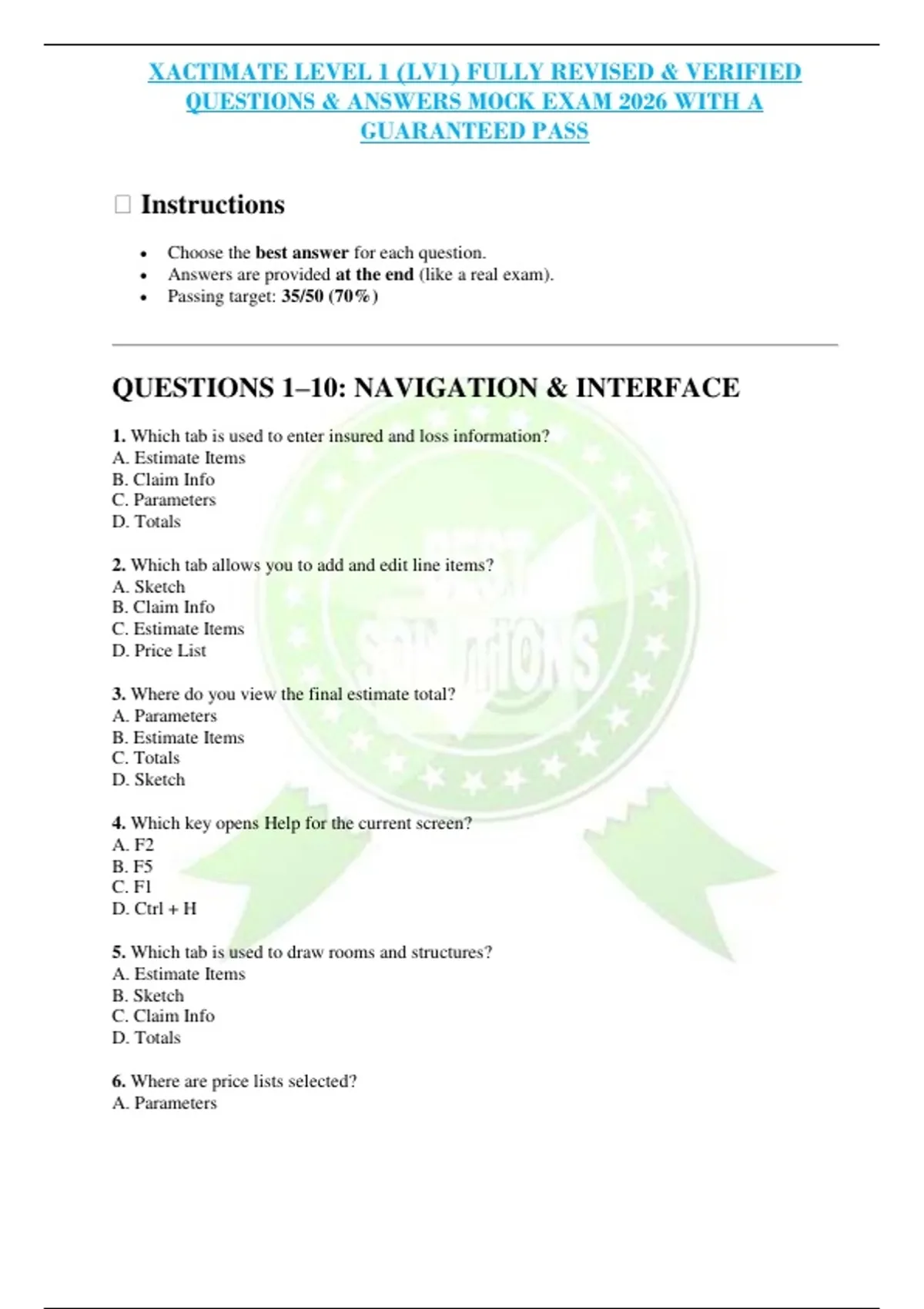 Question 1 Which tab is used to create and modify room sketches? A. Estimate Items B. Sketch C. Claim Info D. Parameters Correct Answer: B ________________________________________ Question 2 Where do you select the price list used for an estimate? A. Claim Info B. Sketch C. Price List D. Parameters Correct Answer: C ____________________________