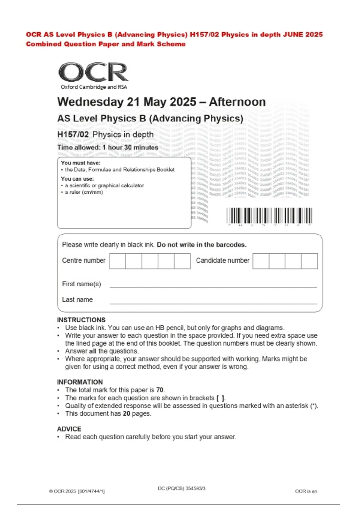 OCR AS Level Physics B (Advancing Physics) H157/01 Foundations of physics MAY 2025 Combined Question Paper and Mark Scheme