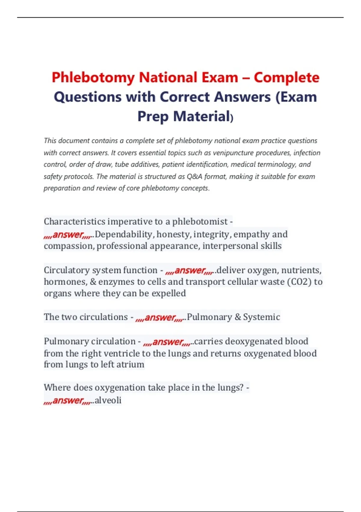Phlebotomy National Exam – Complete Questions with Correct Answers (Exam Prep Material)