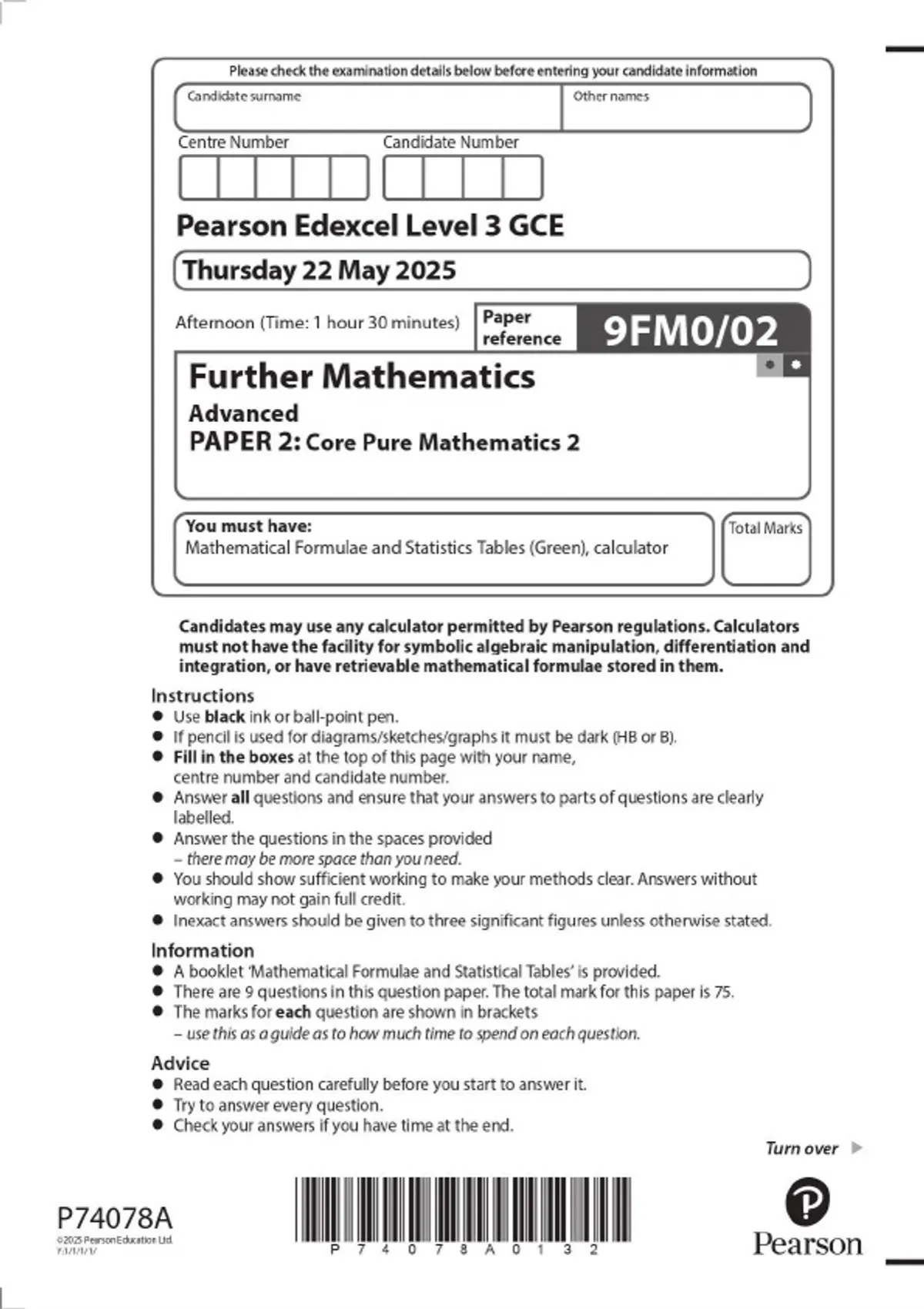 2025 PEARSON EDEXCEL GCE LEVEL 3 Advanced Further Mathematics ( 9FM0) ALL PAPERS WITH QUESTION PAPERS AND MARK SCHEMES