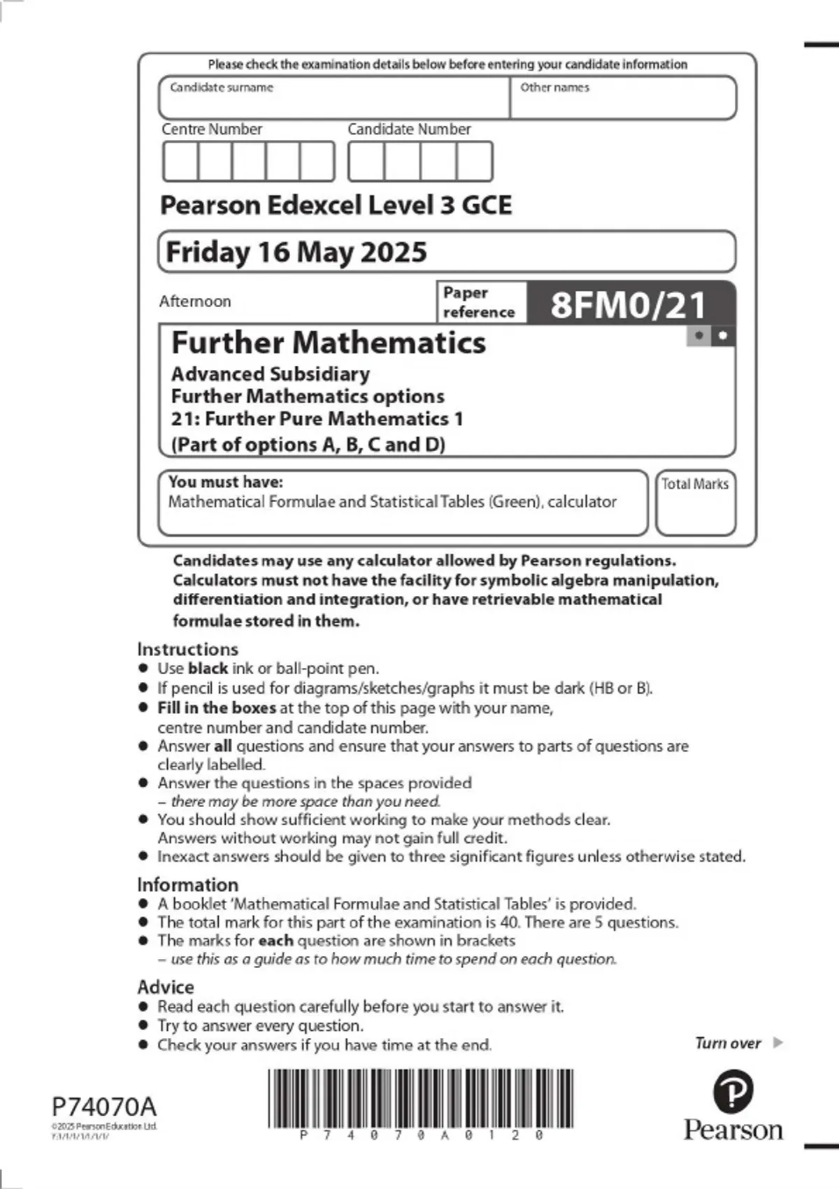 2025 PEARSON EDEXCEL GCE LEVEL 3 Further Mathematics Advanced Subsidiary ( 8FM0) ALL PAPERS WITH QUESTION PAPERS AND MARK SCHEMES