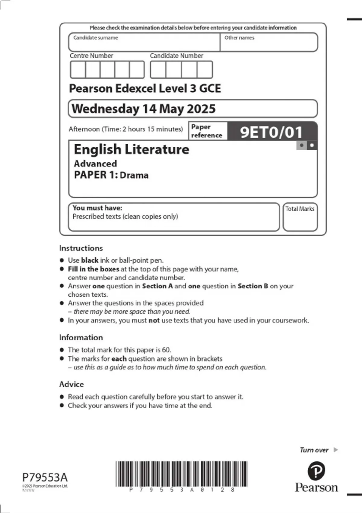 2025 PEARSON EDEXCEL GCE LEVEL 3 English Literature Advanced (9ET0) ALL PAPERS WITH MERGED QUESTION PAPERS AND MARK SCHEMES