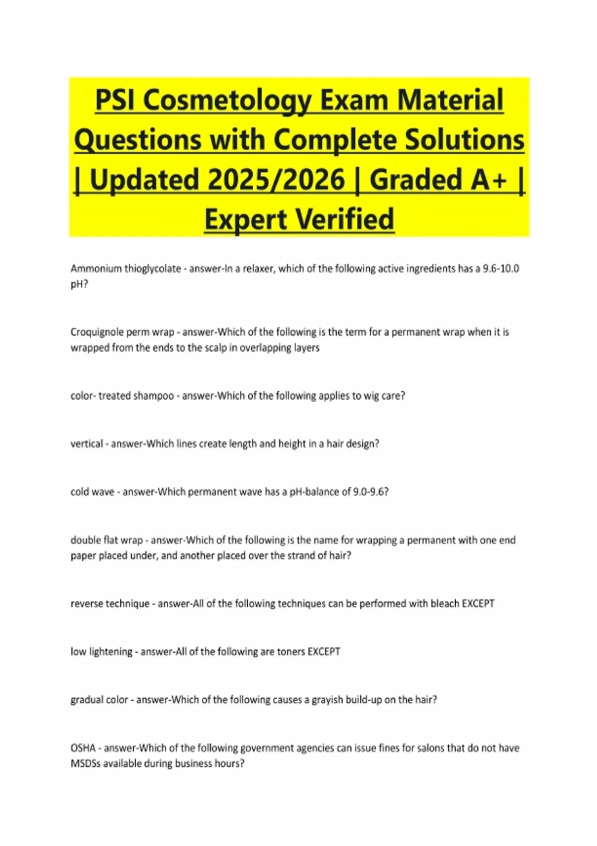 PSI Cosmetology Theory Exam Questions and Answers | Latest Updated 2025/2026 | Graded A+ PSI Cosmetology Exam Material Questions with Complete Solutions | Updated 2025/2026 | Graded A+ | Expert Verified Cosmetology Psi Theory Practice Test Questions and Answers | Latest Updated 2025/2026 | Graded A+