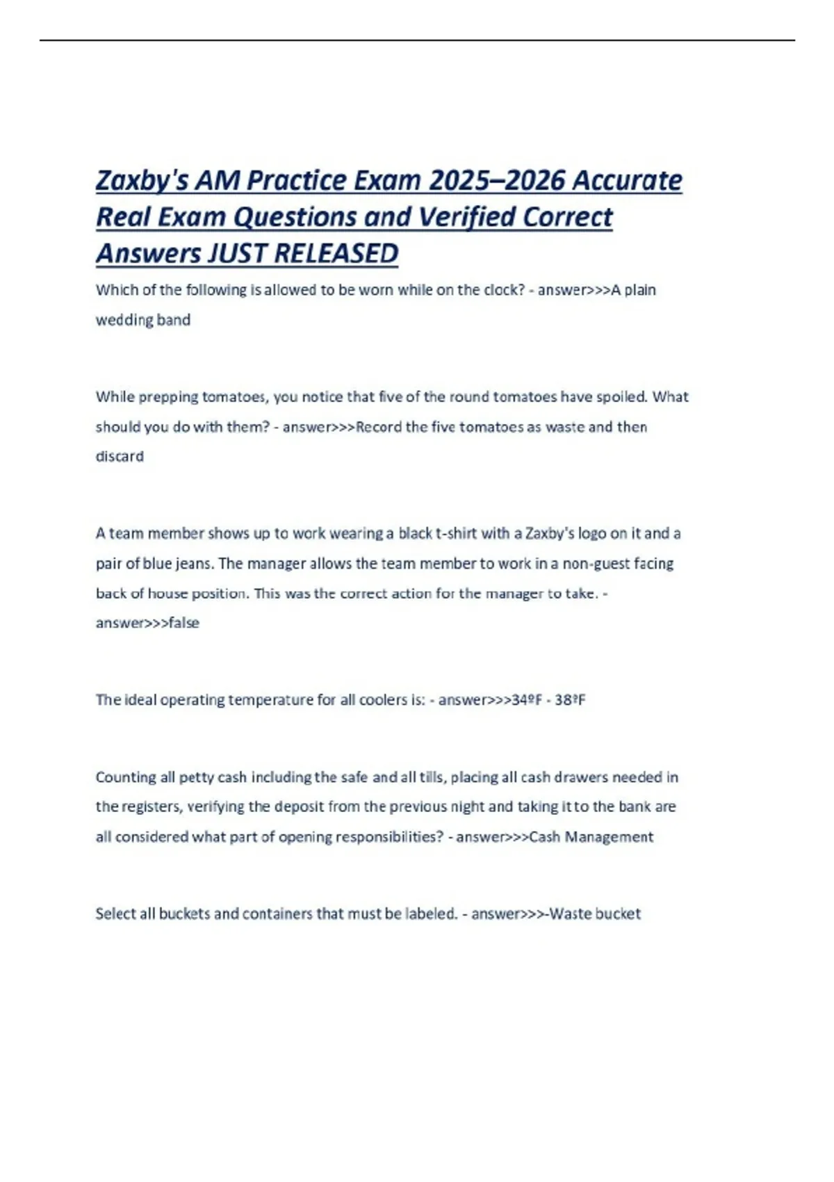 ZAXBY'S CERTIFICATION EXAM PACKAGE DEAL QUESTIONS AND ANSWERS WITH VERIFIED SOLUTIONS UPDATED!!!!