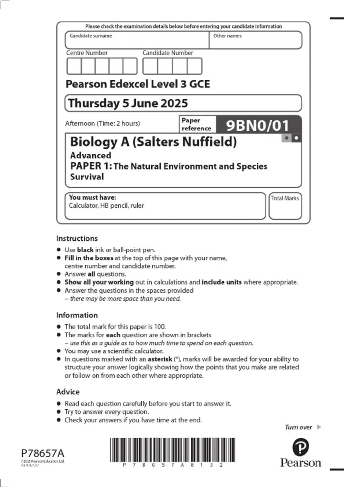 2025 Pearson Edexcel Level 3 GCE 9BN0/01 Biology A (Salters Nuffield) Advanced PAPER 1: The Natural Environment and Species Survival QUESTION PAPER + MARKSCHEME
