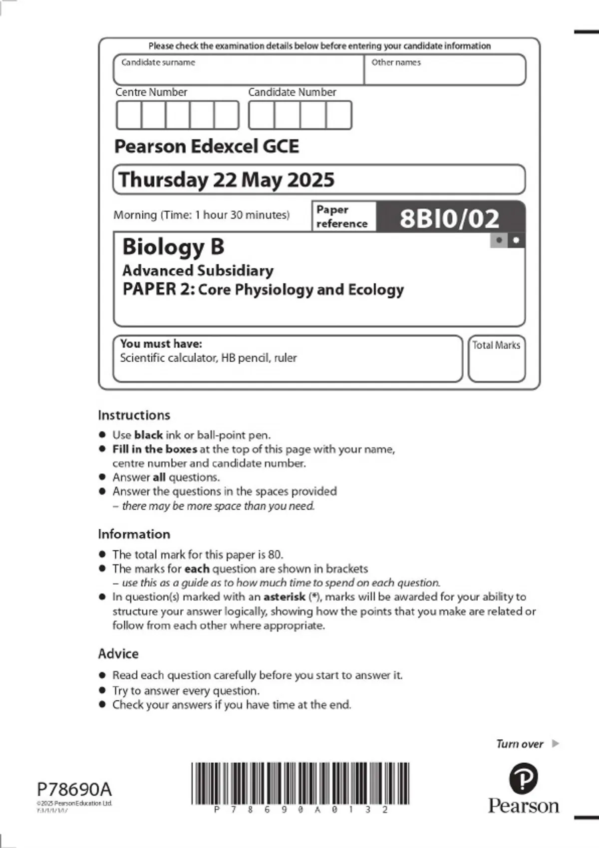 2025 Pearson Edexcel Level 3 GCE 8BI0 Biology B Advanced Subsidiary QUESTION PAPERS & MARKSCHEMES