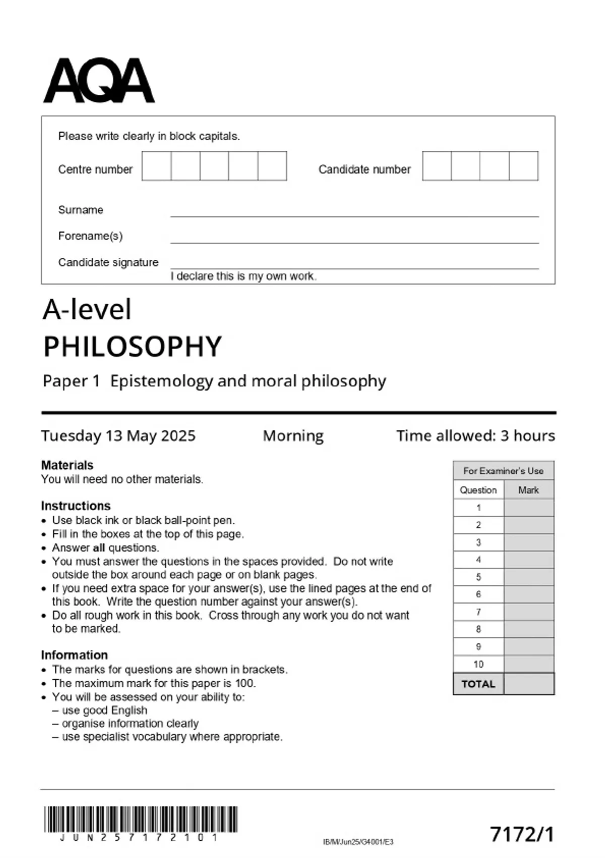AQA 2025 Philosophy A-level 7172/1 Paper 1: Epistemology and moral philosophy MERGED QUESTION PAPER & MARKSCHEME