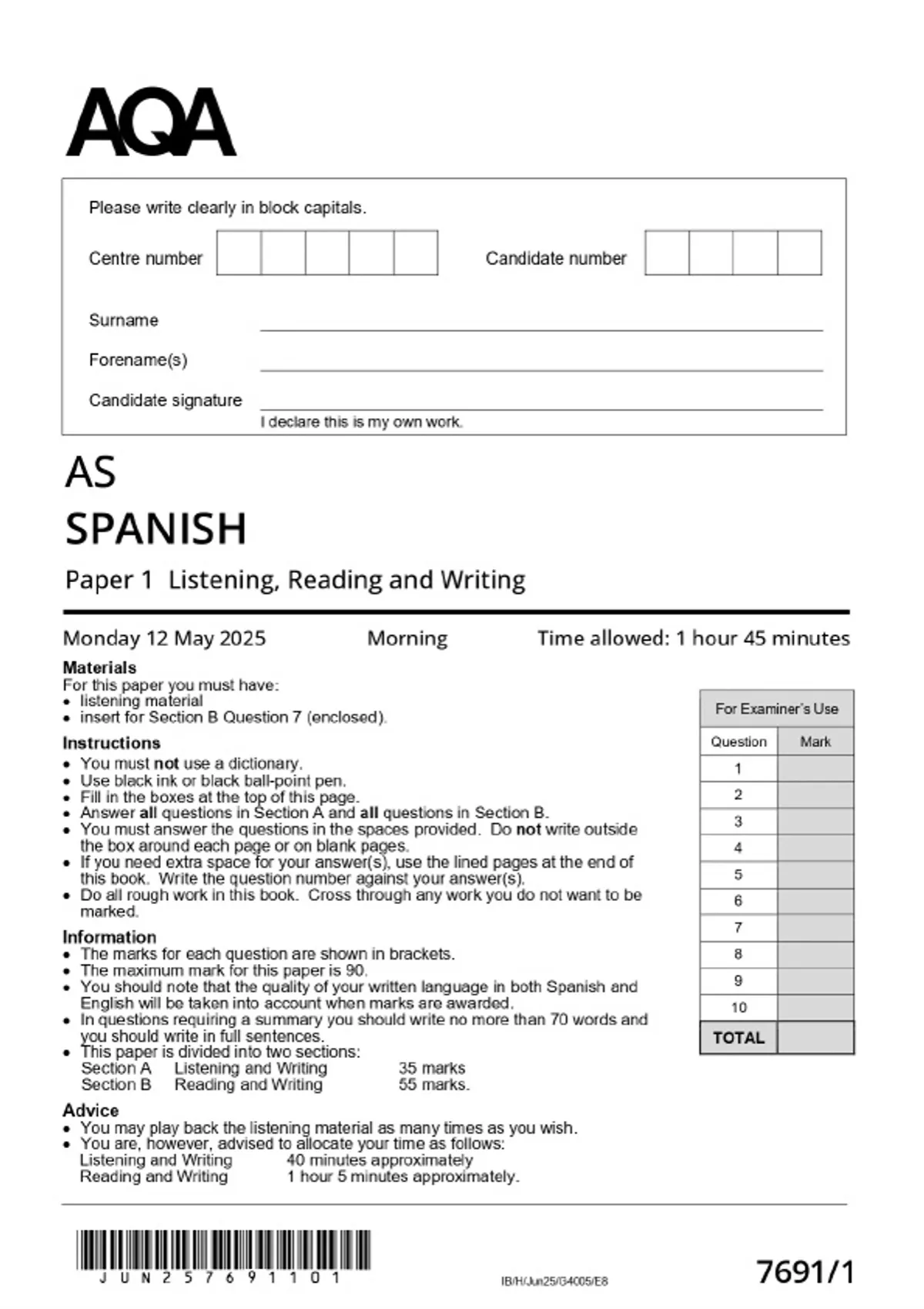 AQA 2025 Spanish AS 7691/1 Paper 1 Listening, reading and writing MERGED QUESTION PAPER & MARKSCHEME