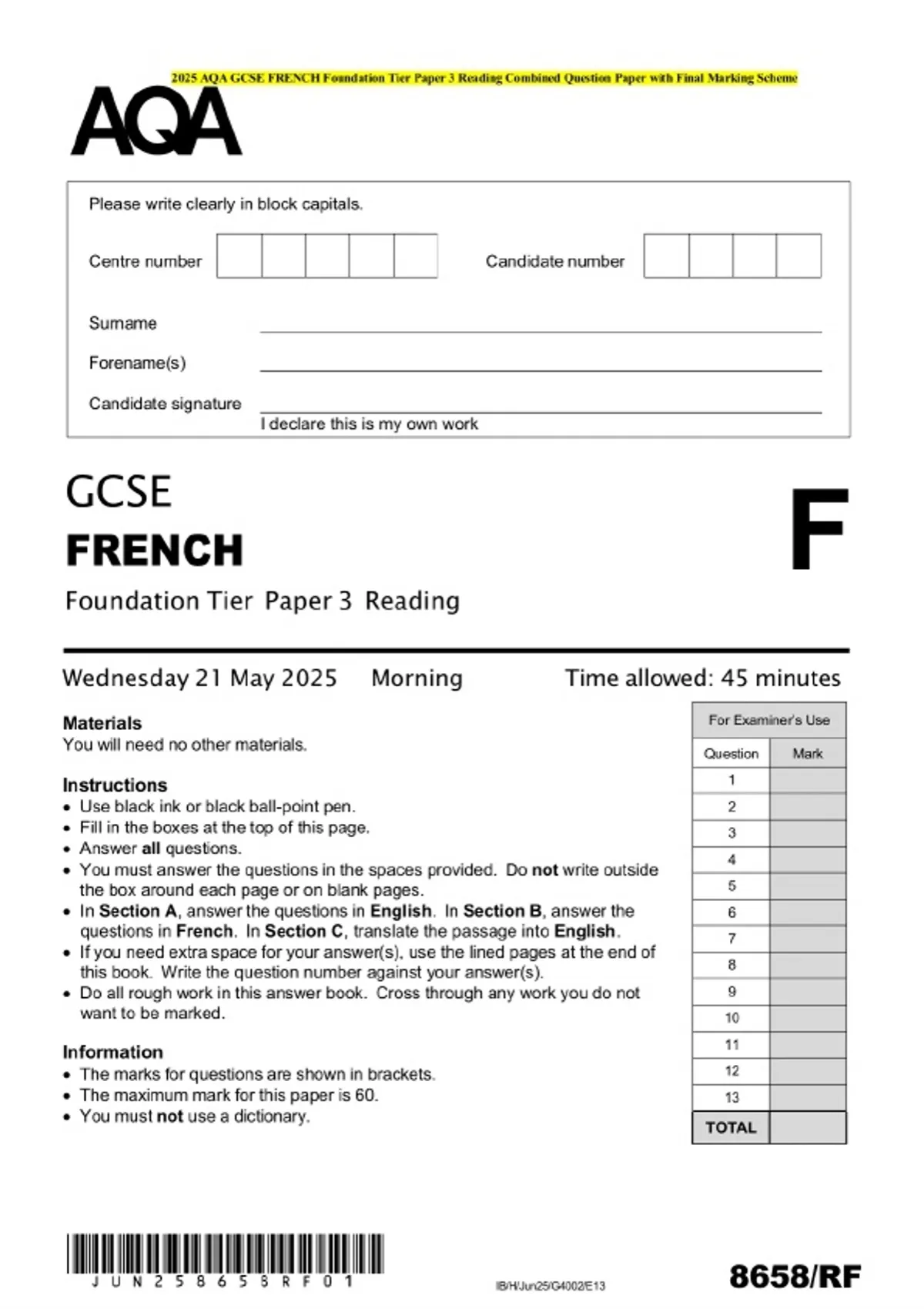 Package Deal-::2025 AQA GCSE FRENCH Foundation Tier EXAMS-Question Paper with Final Marking Scheme MERGED