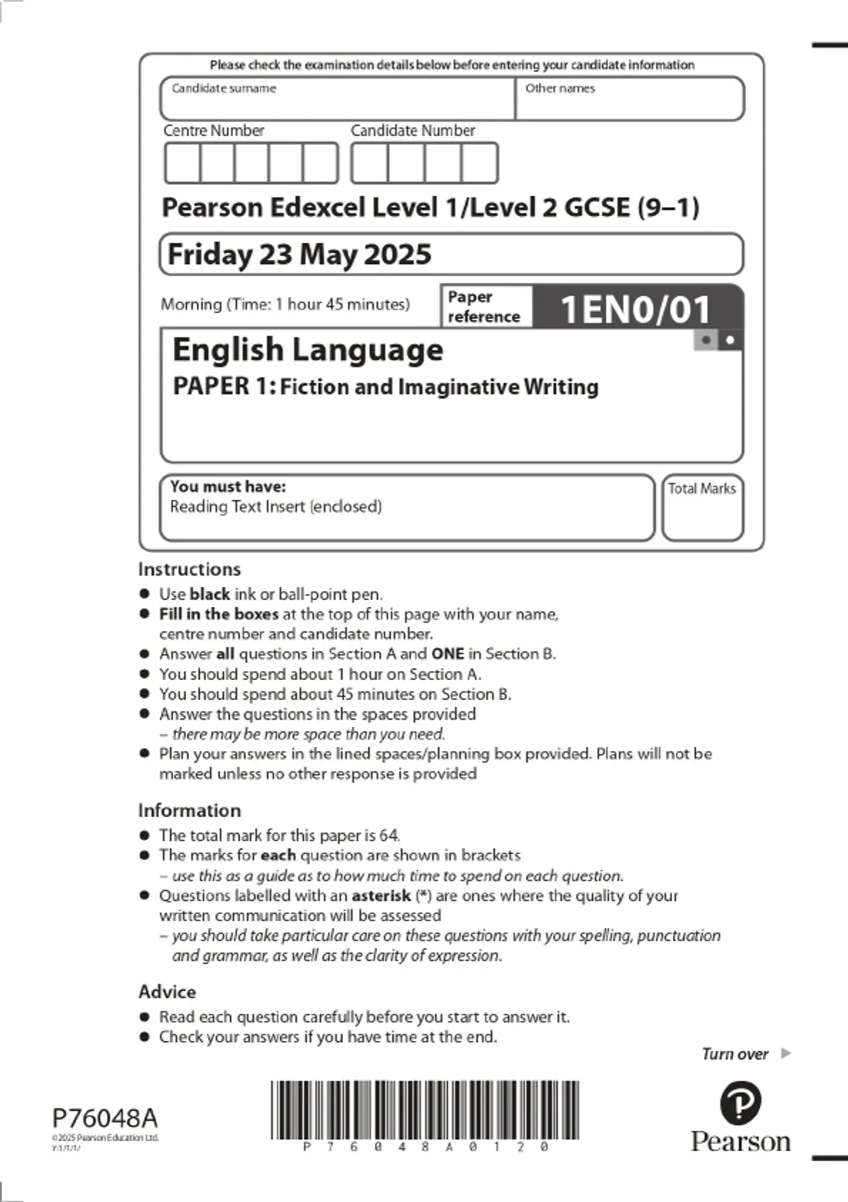 2025 Pearson Edexcel Level 1/Level 2 GCSE (9–1) English Language Paper 1: fiction and imaginative Writing Combined Question Paper & Marking Scheme 2 Exam (elaborations) 2025 Pearson Edexcel Level 1/Level 2 GCSE (9–1) English Language PAPER 2: Non-fiction and Transactional Writing Combined Question Paper & Marking Scheme