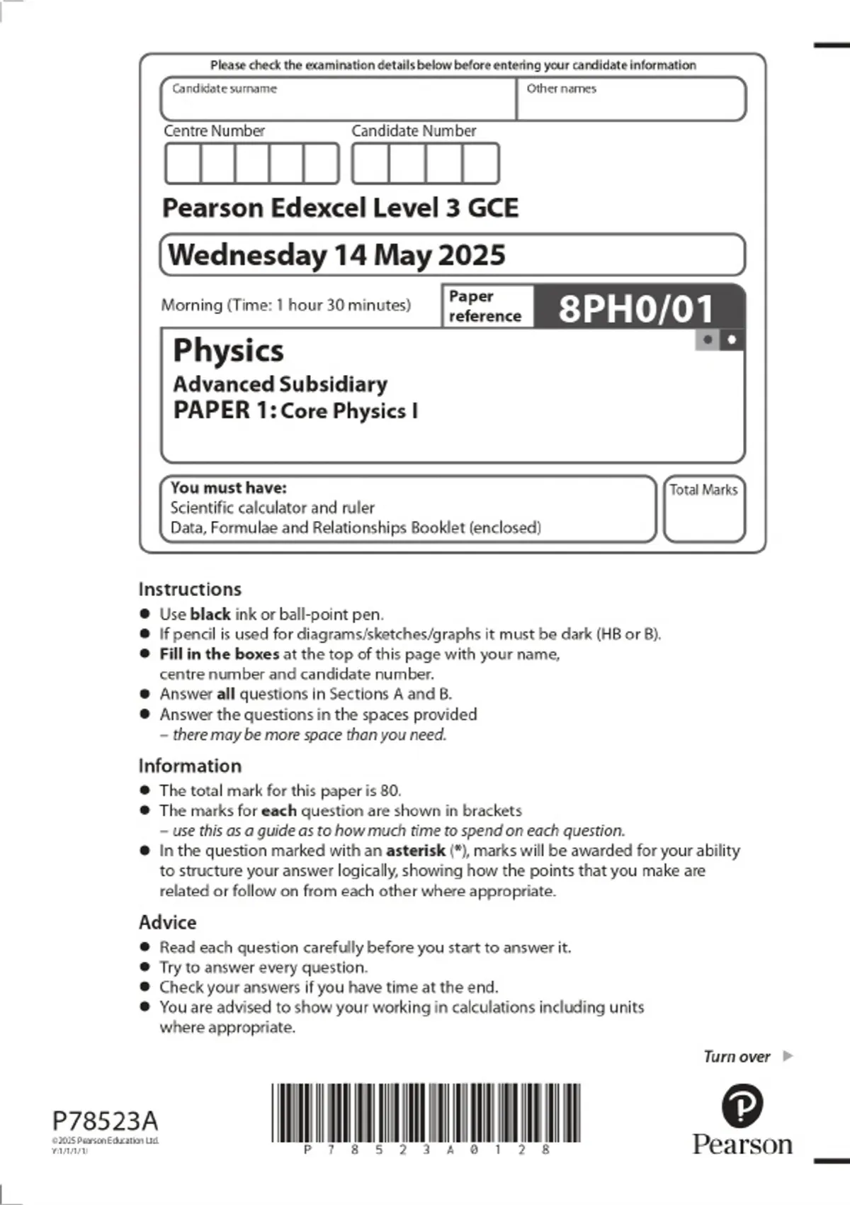 2025 Pearson Edexcel Level 3 GCE Physics Advanced Subsidiary PAPER 1: Core Physics I Combined Question Paper & Final Marking Scheme 2 Exam (elaborations) 2025 Pearson Edexcel Level 3 GCE Physics Advanced Subsidiary PAPER 2: Core Physics II Combined Question Paper & Final Marking Scheme 3 Exam (elaborations) 2025 Pearson Edexcel Level 3 GCE Physic