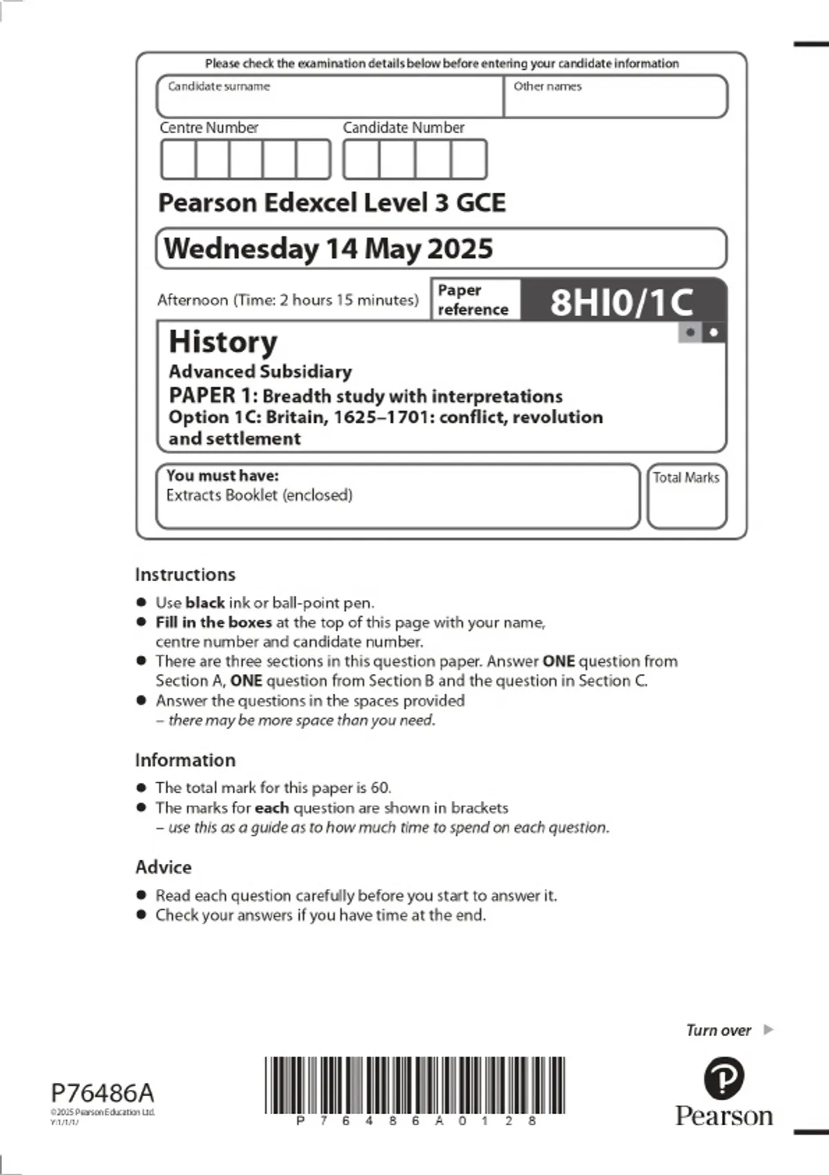 2025 Pearson Edexcel Level 3 GCE History Advanced Subsidiary PAPER 1: Breadth study with interpretations Option 1C: Britain, 1625–1701: conflict, revolution and settlement Combined Question Paper & Final Marking Scheme