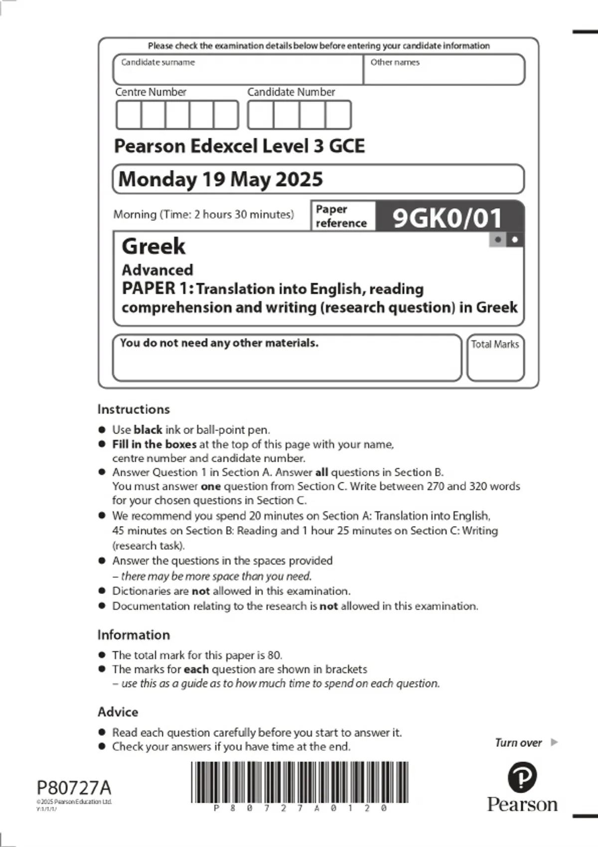 2025 Pearson Edexcel Level 3 GCE Greek Advanced PAPER 1: Translation into English, reading comprehension and writing (research question) in Greek Combined Question Paper & Final Marking Scheme 2 Exam (elaborations) 2025 Pearson Edexcel Level 3 GCE Greek Advanced PAPER 2: Translation into Greek and written response to works Combined Question Paper