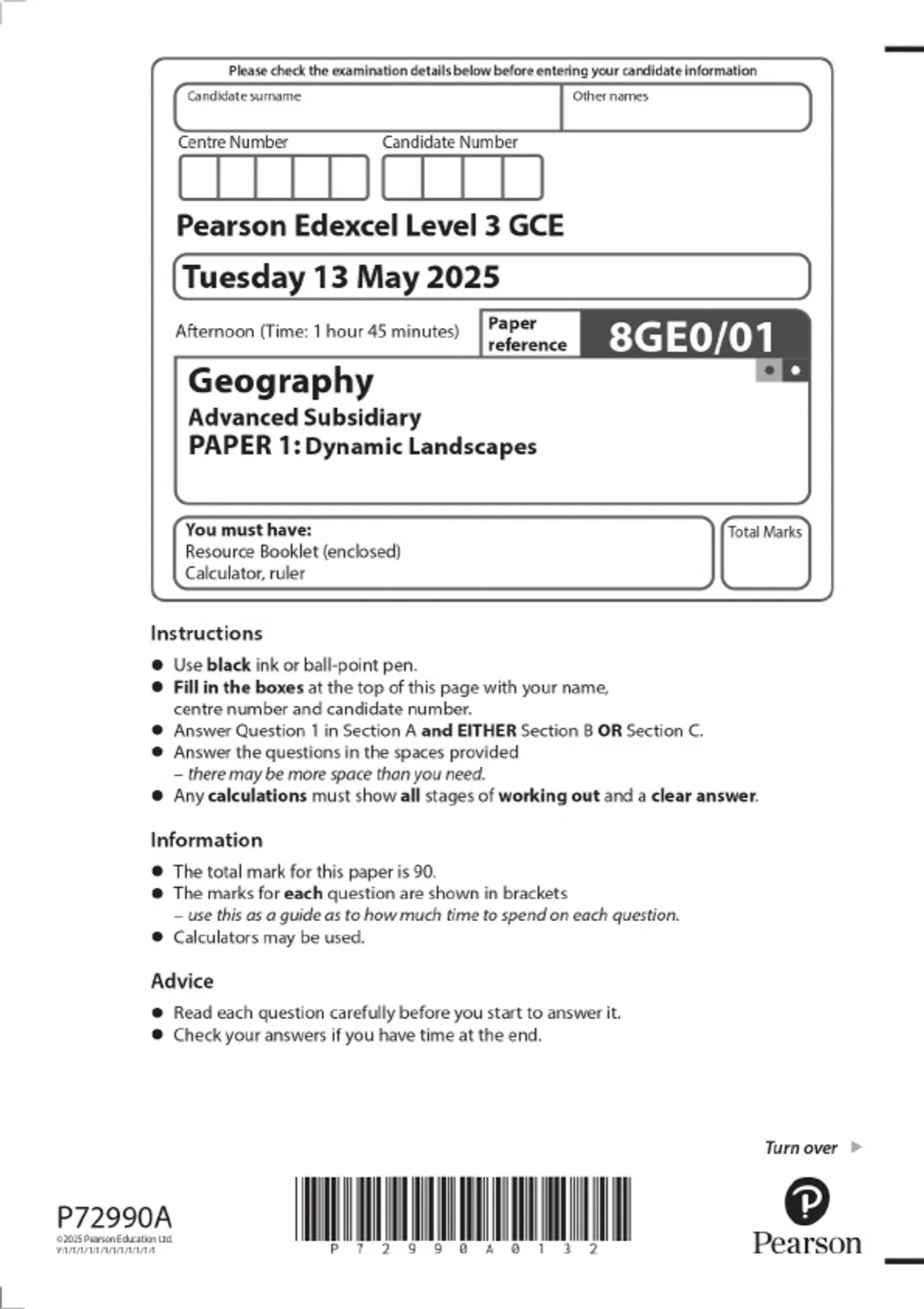 2025 Pearson Edexcel Level 3 GCE Geography Advanced Subsidiary PAPER 1: Dynamic Landscapes Combined Question Paper & Final Marking Scheme 2 Exam (elaborations) 2025 Pearson Edexcel Level 3 GCE Geography Advanced Subsidiary PAPER 2: Dynamic Places Combined Question Paper & Final Marking Scheme 3 Exam (elaborations) 2025 Pearson Edexcel Level 3 GCE