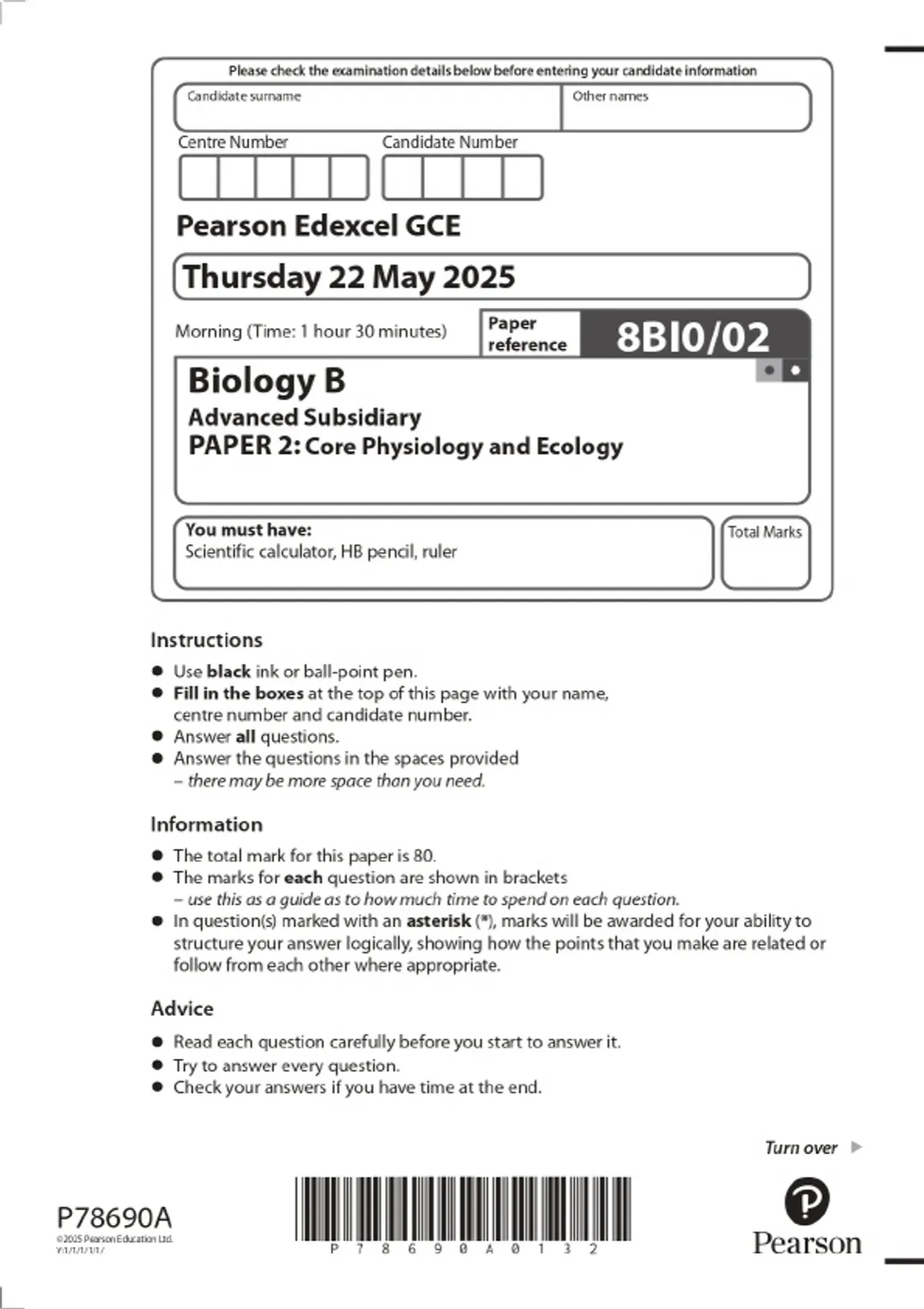 2025 Pearson Edexcel Level 3 GCE Biology B Advanced Subsidiary PAPER 2: Core Physiology and Ecology Combined Question Paper and Final Marking Scheme 2 Exam (elaborations) 2025 Pearson Edexcel Level 3 GCE Biology B Advanced PAPER 1: Advanced Biochemistry, Microbiology and Genetics Combined Question Paper and Final Marking Scheme 3 Exam (elaboratio