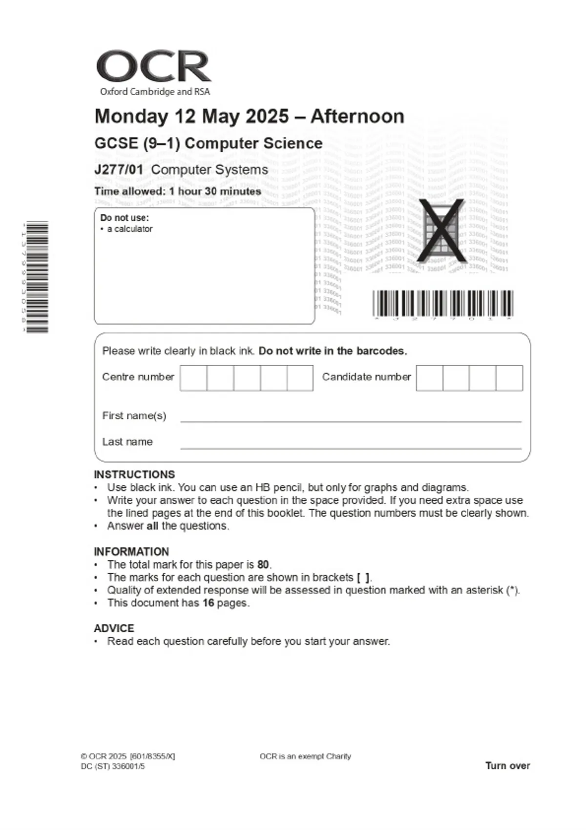 2025 OCR GCSE (9–1) Computer Science J277/01 Computer Systems Combined Question Paper & Final Marking Scheme 2 Exam (elaborations) 2025 OCR GCSE (9–1) Computer Science J277/02 Computational thinking, algorithms and programming Combined Question Paper & Final Marking Scheme