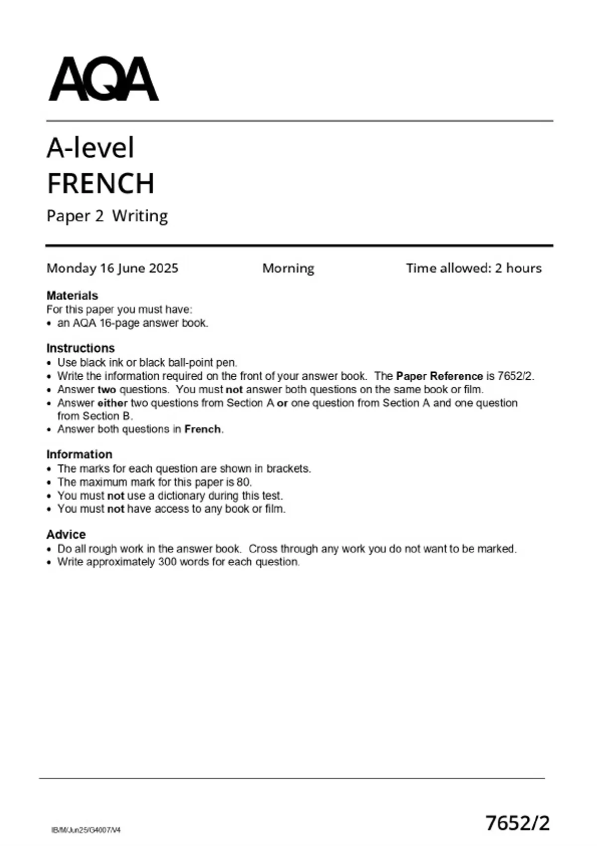 2025 AQA A-LEVEL French Paper 2 (7652/2) Writing MERGED QUESTION PAPER & MARKSCHEME