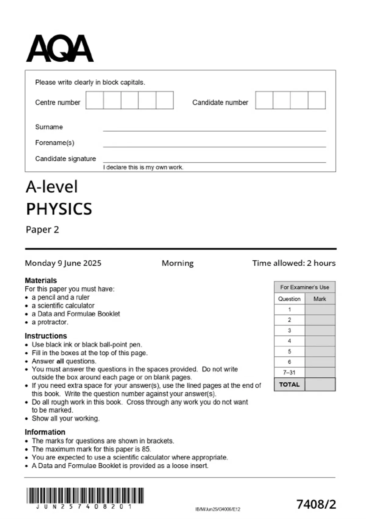 2025 AQA A-LEVEL Physics 7408/2 Paper 2 MERGED QUESTION PAPER & MARKSCHEME
