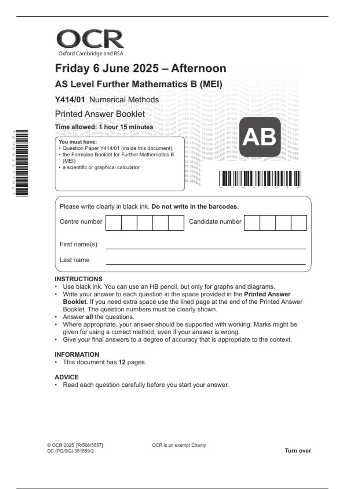2025 AS-LEVEL OCR FURTHER MATHEMATICS B (MEI) NUMERICAL METHODS WITH MARK SCHEME