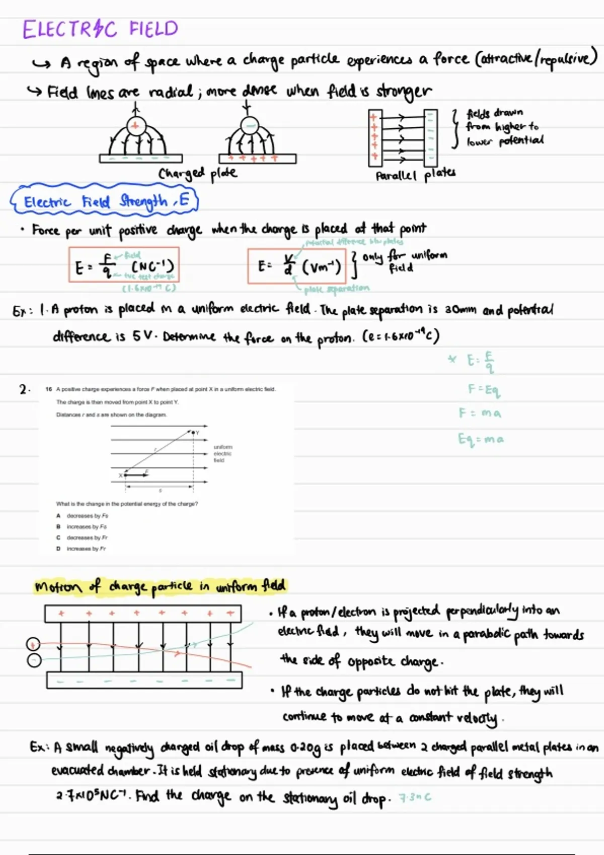 CAIE (International) A2 notes on Physics: Electric Field. Includes practices with some answers. A good summary notes to go through the entire of Electric Field in A2. Copied diagrams included are not mine, everything else hand-illustrated belongs to me. This note is used for my tutoring classes. Recommended to use appropriately with Edexcel/CIE.
