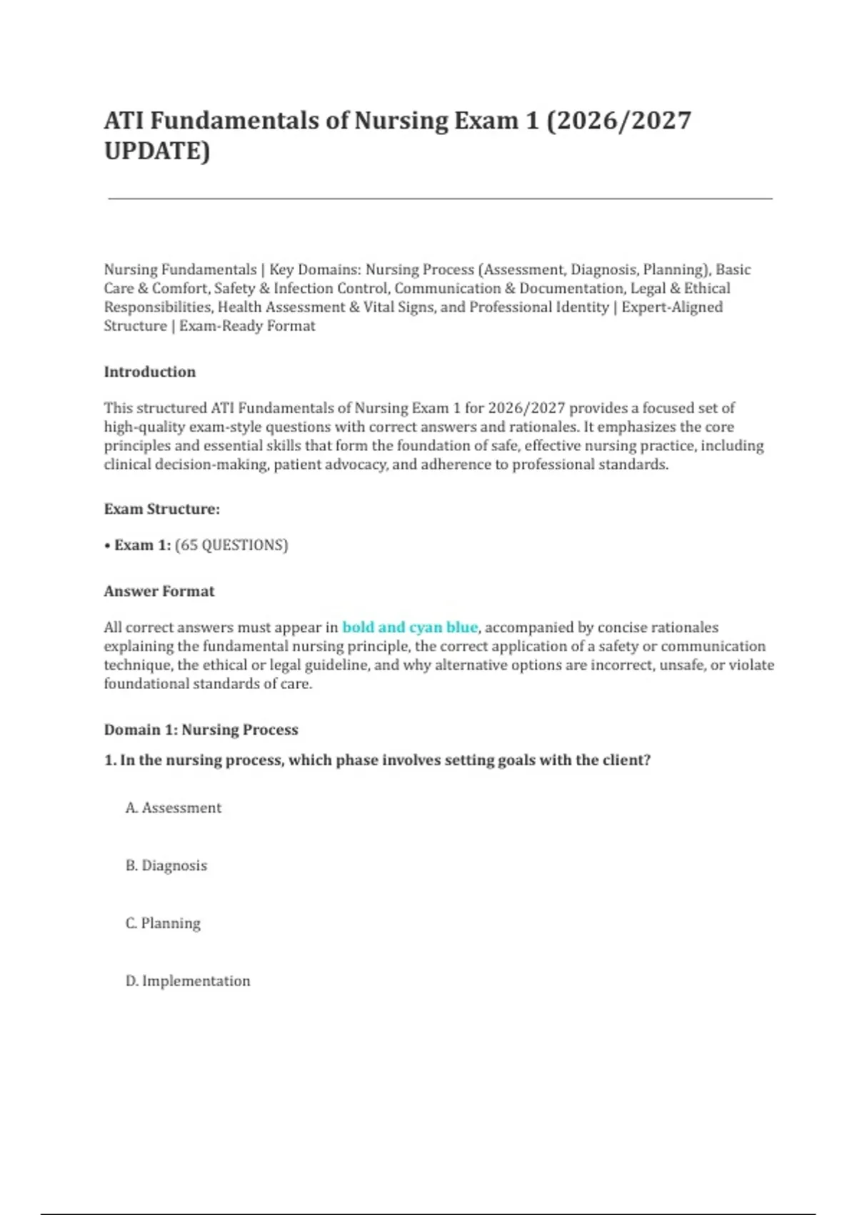 Nursing Fundamentals | Key Domains: Nursing Process (Assessment, Diagnosis, Planning), Basic