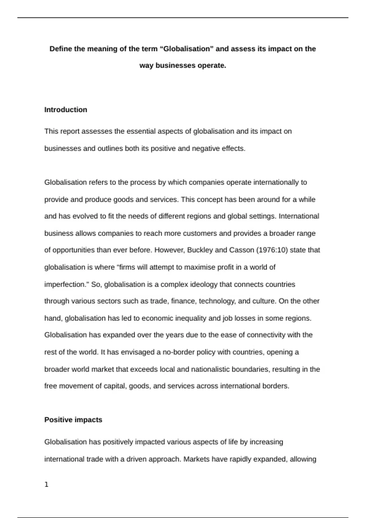 Define the meaning of the term “Globalisation” and assess its impact on the