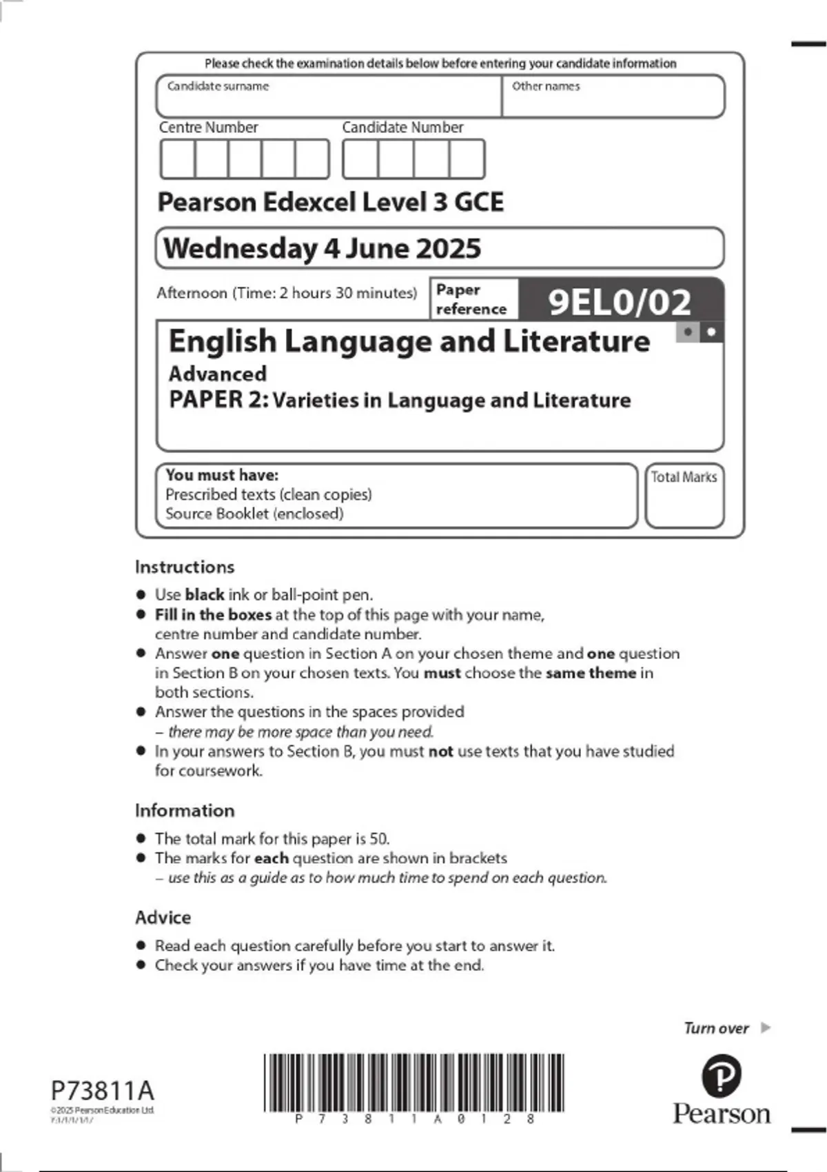 2025 Pearson Edexcel Level 3 GCE 9EL0/02 English Language and Literature Advanced PAPER 2: Varieties in Language and Literature