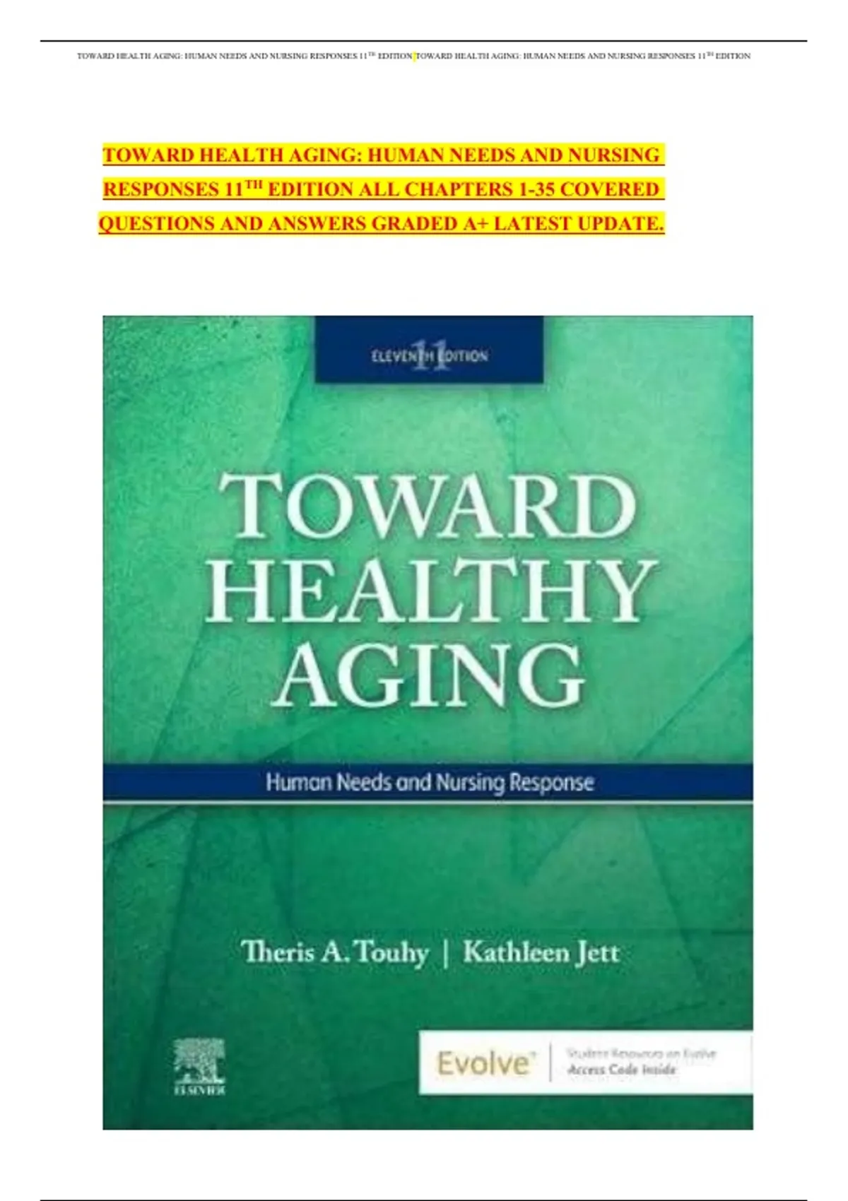 This document covers all chapters 1–35 from the 11th edition of Toward Healthy Aging: Human Needs and Nursing Responses. It includes comprehensive exam-style questions and verified answers addressing aging processes, human needs, gerontological nursing care, and appropriate nursing responses. The material is fully updated and designed to support exam preparation and in-depth understanding of healthy aging concepts.