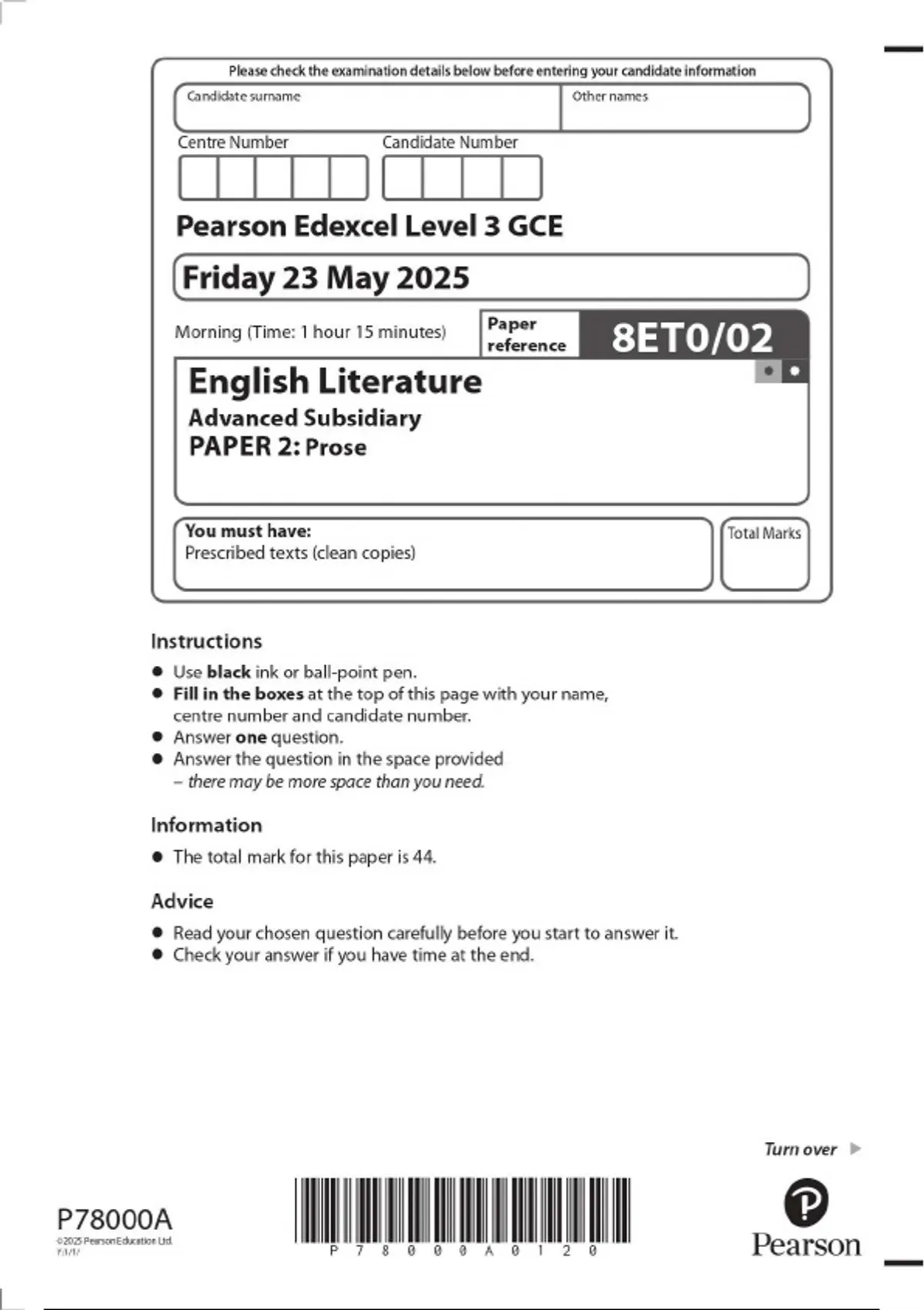 2025 Pearson Edexcel Level 3 GCE 8ET0/02 English Literature Advanced Subsidiary PAPER 2: Prose