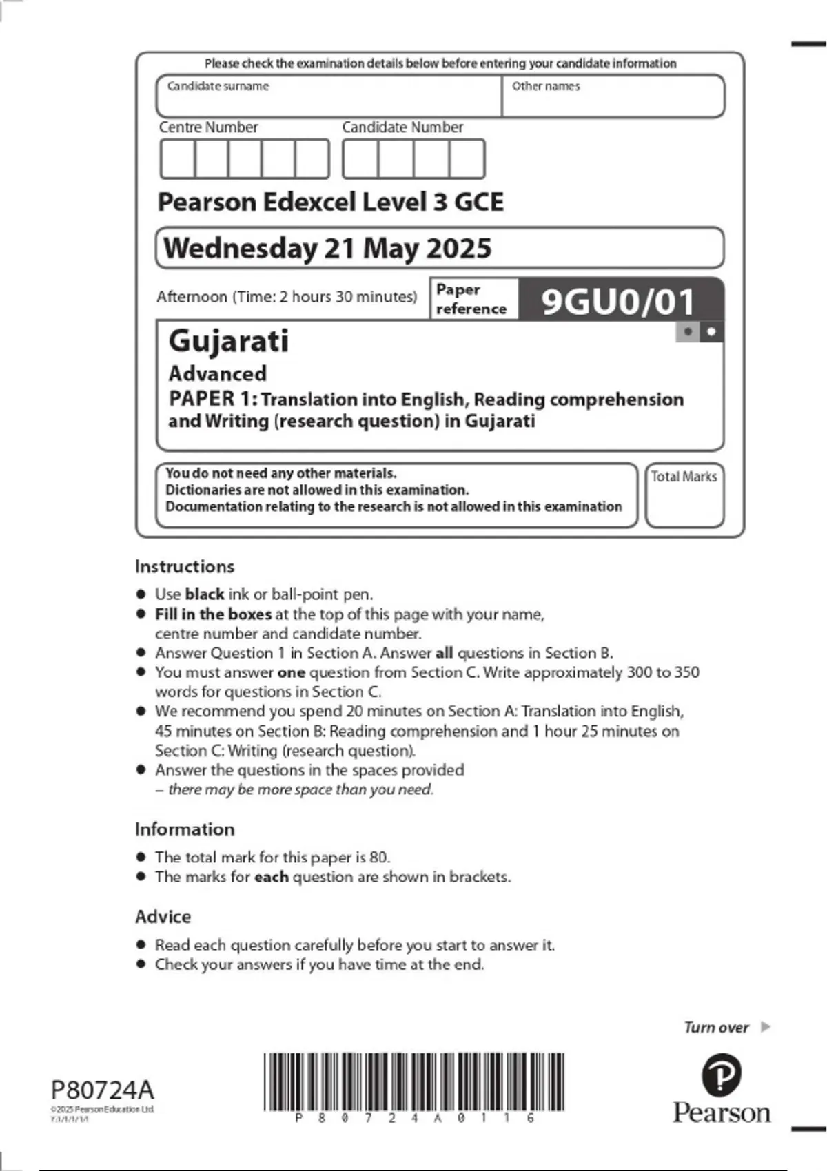 2025 Pearson Edexcel Level 3 GCE 9GU0/01 Gujarati Advanced PAPER 1: Translation into English, Reading comprehension and Writing (research question) in Gujarati
