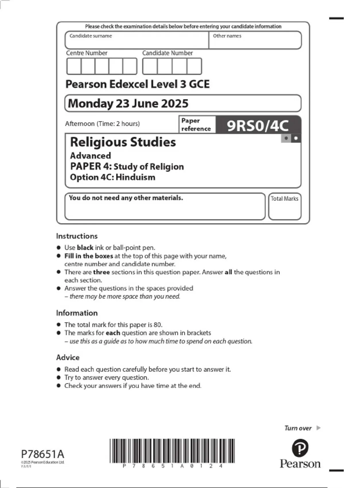2025 Pearson Edexcel Level 3 GCE 9RS0/4C Religious Studies Advanced PAPER 4: Study of Religion Option 4C: Hinduism