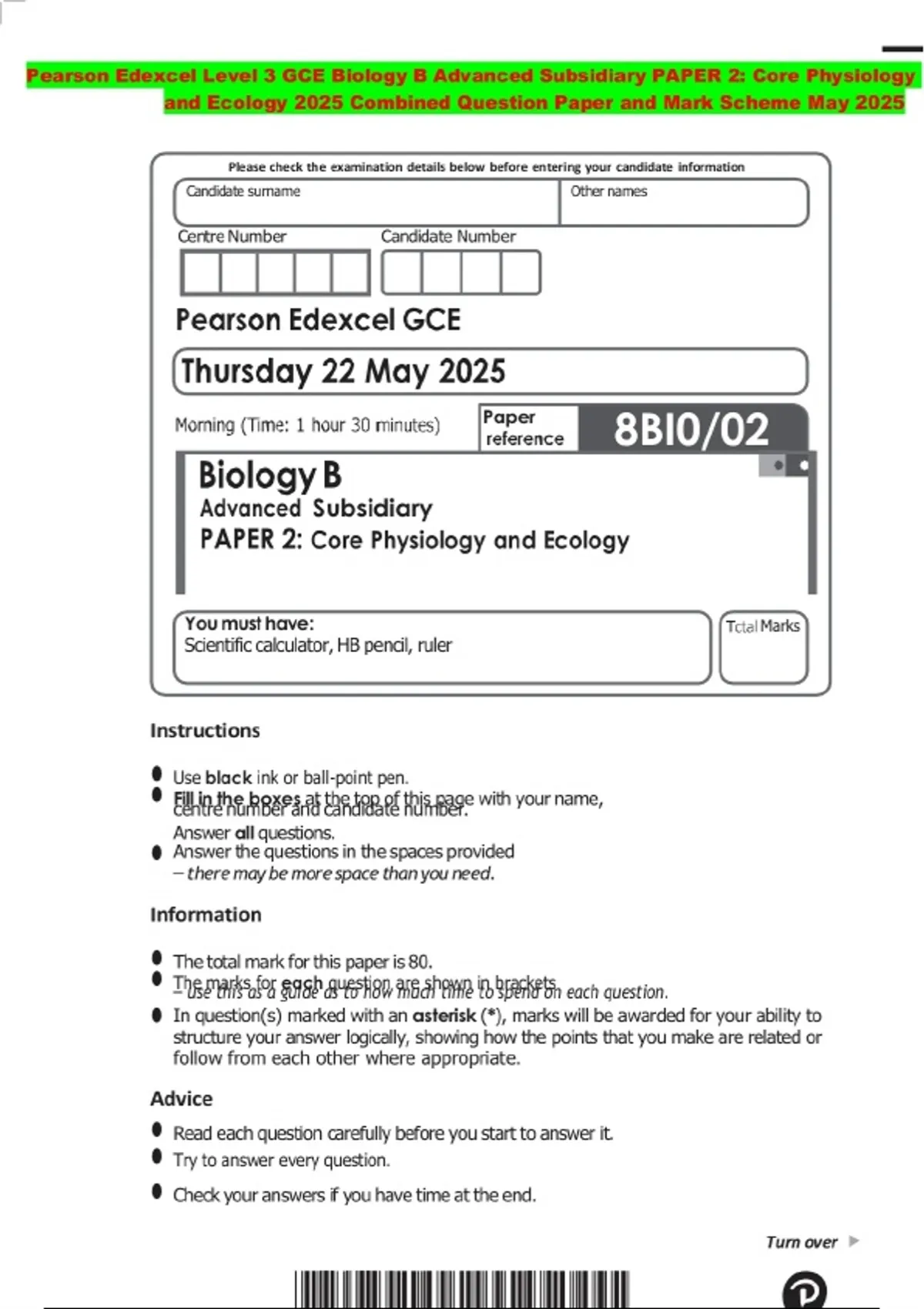 Pearson Edexcel Level 3 GCE Biology B Advanced Subsidiary PAPER 2: Core Physiology and Ecology 2025 Combined Question Paper and Mark Scheme May 2025
