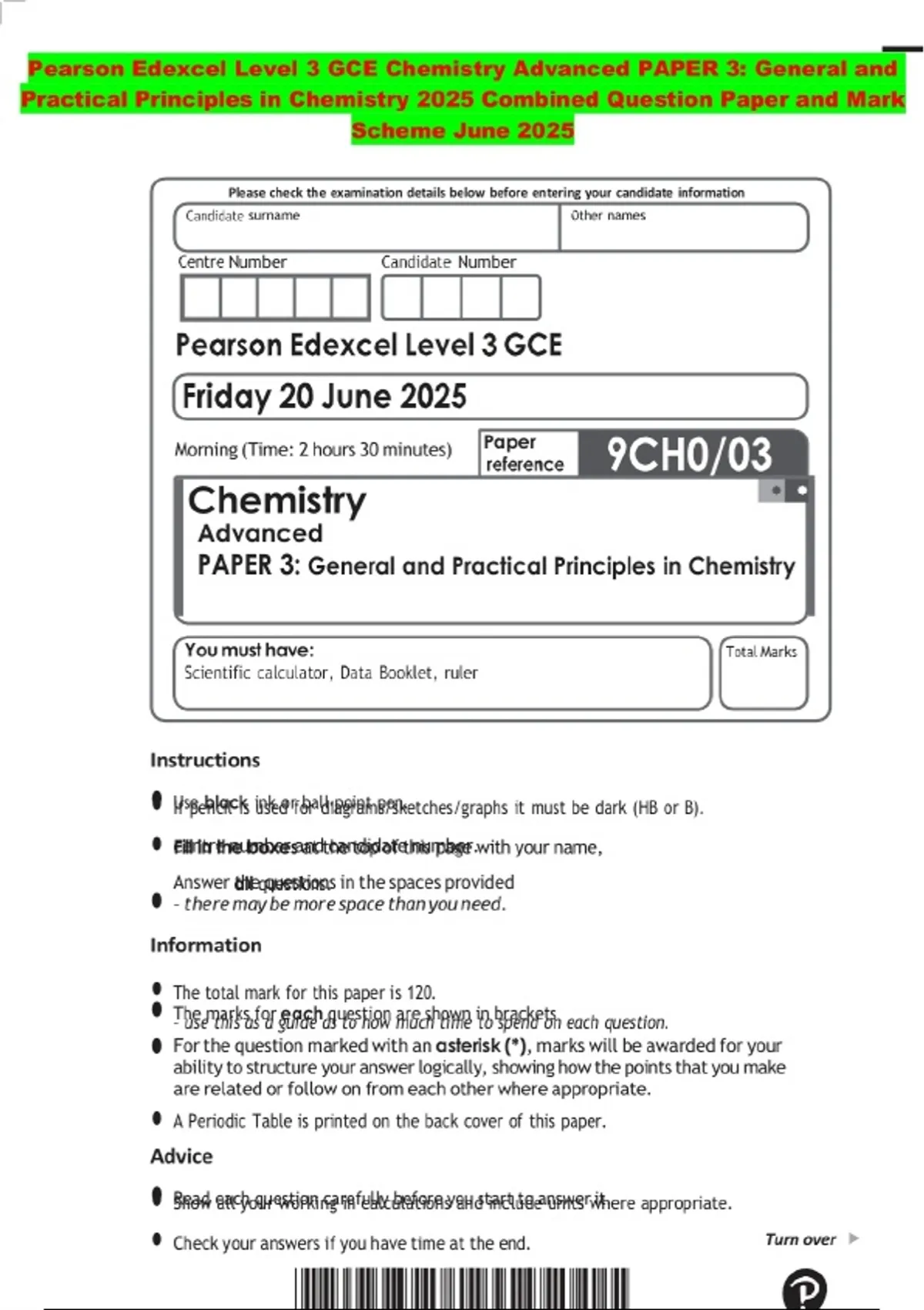 Pearson Edexcel Level 3 GCE Chemistry Advanced PAPER 3: General and Practical Principles in Chemistry 2025 Combined Question Paper and Mark Scheme June 2025