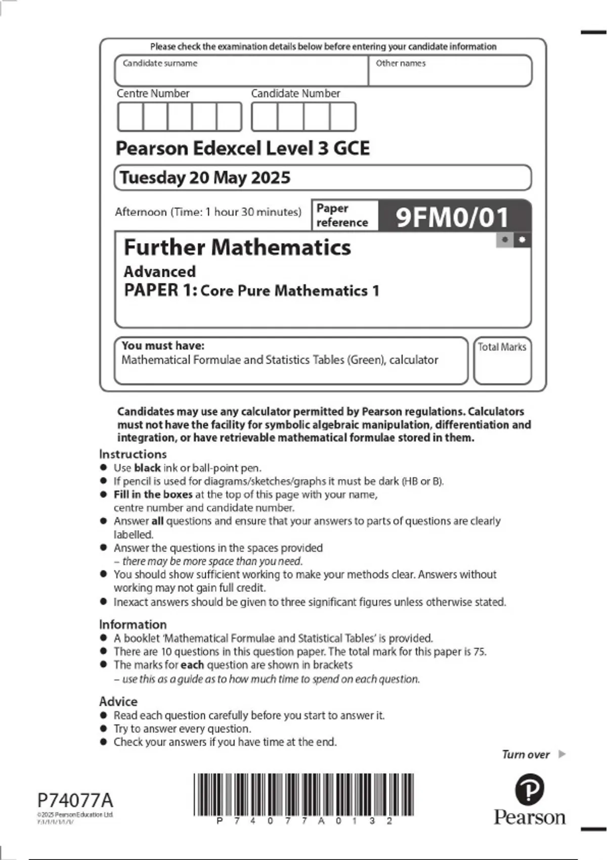 2025 pearson edexcel level 3 gce 9fm001 further m