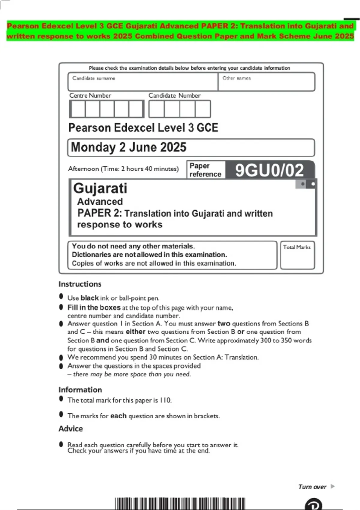 Pearson Edexcel Level 3 GCE Gujarati Advanced PAPER 2: Translation into Gujarati and written response to works 2025 Combined Question Paper and Mark Scheme June 2025