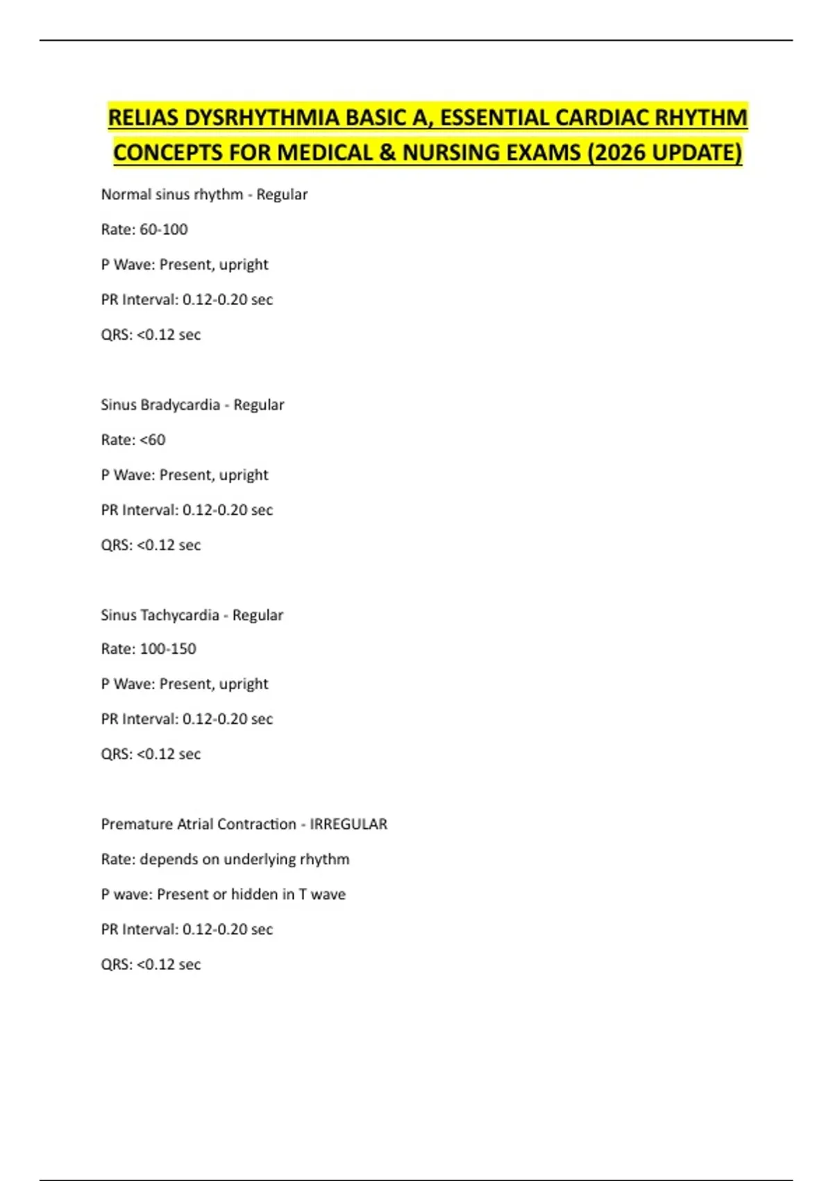 This document covers the essential cardiac rhythm concepts included in the Relias Dysrhythmia Basic A module, focusing on foundational ECG interpretation and normal versus abnormal rhythms. It is designed to support medical and nursing students in exam preparation by clearly explaining key principles and commonly tested concepts. Updated for 2026, the material aligns with current educational standards and clinical practice.