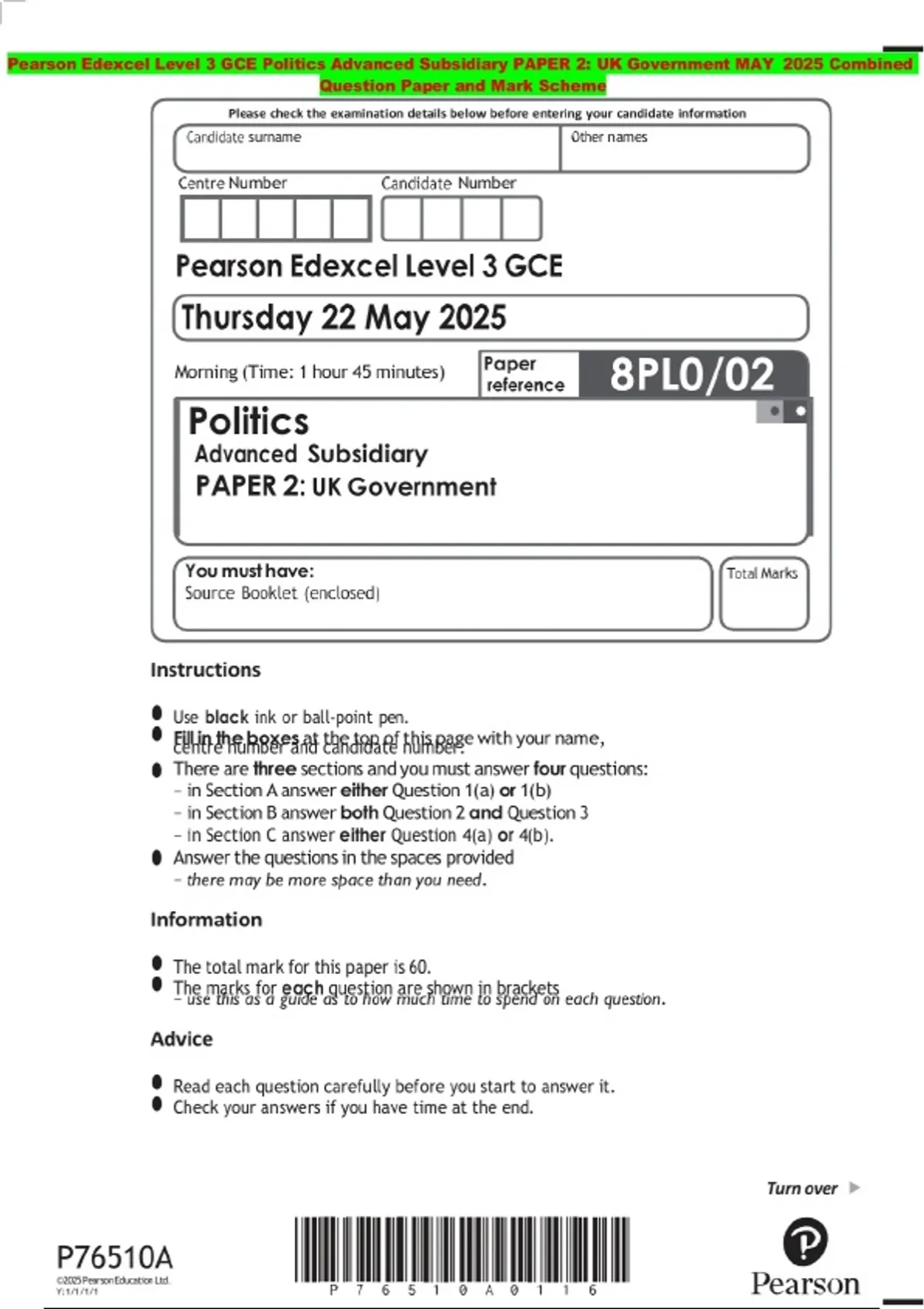 Pearson Edexcel Level 3 GCE Politics Advanced Subsidiary PAPER 2: UK Government MAY 2025 Combined Question Paper and Mark Scheme