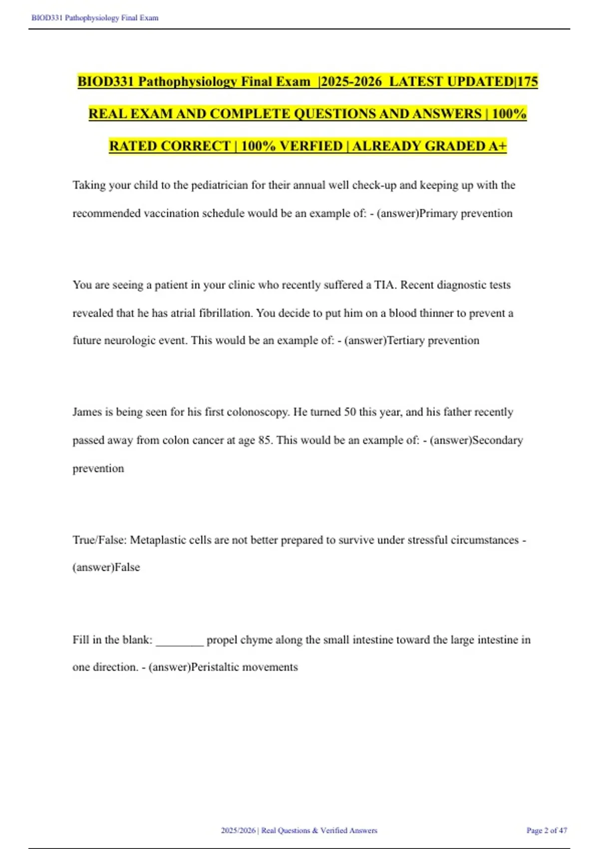 Prepare for the BIOD331 Pathophysiology Final Exam with this all-in-one study guide. Includes full practice questions, detailed answers, key concepts, and effective strategies to help you excel and achieve top grades.