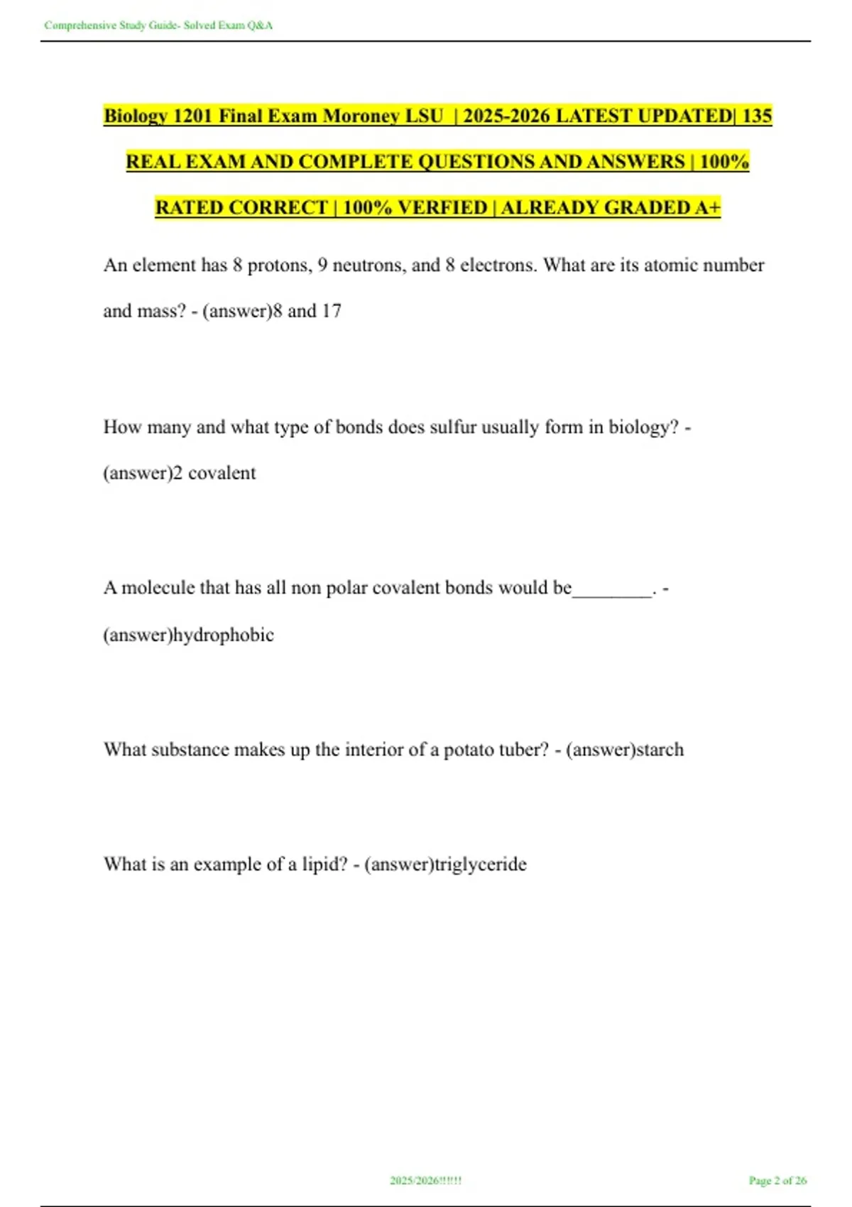 Biology 1201 Final Exam Moroney LSU | 2025-2026 LATEST UPDATED| 135