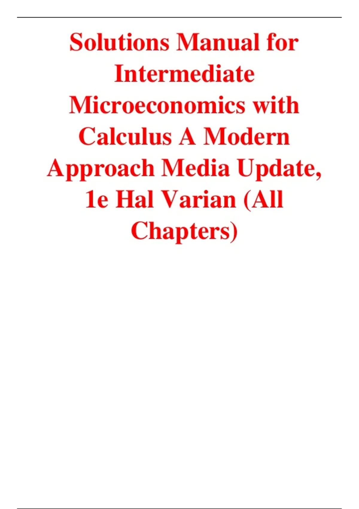 This solutions manual covers all chapters of Intermediate Microeconomics with Calculus: A Modern Approach, Media Update, 1st Edition by Hal Varian. It provides detailed, step-by-step solutions to the textbook’s exercises, focusing on mathematical and graphical analysis of microeconomic theory. The content supports students in mastering optimization, consumer and producer theory, market structures, and general equilibrium using calculus-based methods.