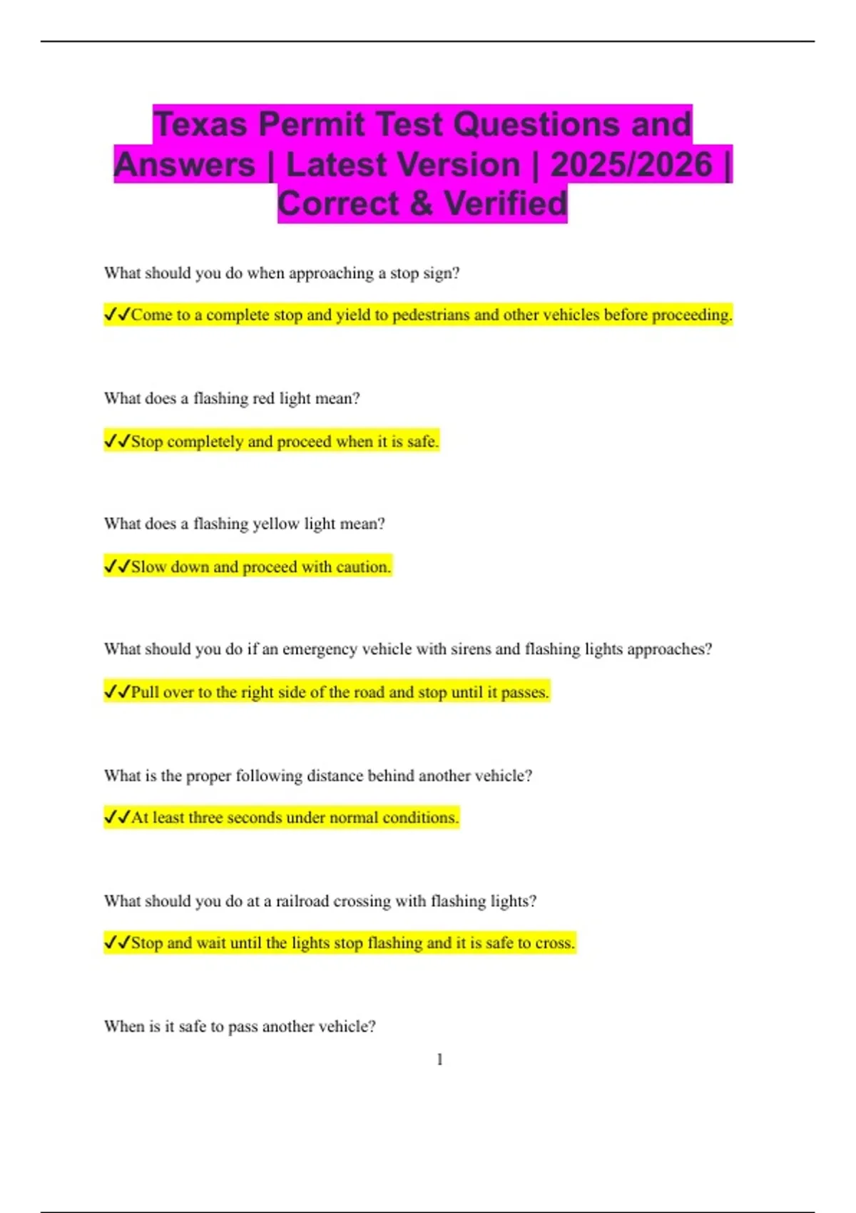 Texas Permit Test Questions and Answers | Latest Version | 2025/2026 | Correct & Verified What should you do when approaching a stop sign? Come to a complete stop and yield to pedestrians and other vehicles before proceeding. What does a flashing red light mean? Stop completely and proceed when it is safe. What does a flashing yellow light mean? Slow down and proceed with caution. What should you do if an emergency vehicle with sirens and flashing lights approaches? Pull over to the right side of the road and stop until it passes. What is the proper following distance behind another vehicle? At least three seconds under normal conditions. What should you do at a railroad crossing with flashing lights? Stop and wait until the lights stop flashing and it is safe to cross. When is it safe to pass another vehicle? 2 Only when the lane ahead is clear and it is legal to pass. What is the hand signal for a left turn? Left arm extended straight out. What is the hand signal for a right turn? Left arm bent upward at a 90-degree angle. What is the hand signal for stopping or slowing down? Left arm bent downward at a 90-degree angle. What should you do when approaching a school bus with flashing red lights? Stop and remain stopped until the lights stop flashing and the bus moves. What is the proper procedure for making a right turn on red? Stop completely, check for traffic and pedestrians, then turn when safe. When must you use your headlights? From sunset to sunrise and during conditions of poor visibility. What should you do if your vehicle starts to skid? Turn the steering wheel in the direction of the skid and avoid braking suddenly. 3 What is the proper way to enter a freeway? Accelerate on the entrance ramp to match traffic speed and merge safely. What is the correct lane position for making a left turn? Leftmost lane designated for turning. What is the correct lane position for making a right turn? Rightmost lane designated for turning. When should you signal before changing lanes? At least 100 feet before the maneuver. What is the correct action when approaching a four-way stop? Yield to the vehicle that arrived first; if two arrive simultaneously, yield to the vehicle on the right. What is the meaning of a solid yellow line on your side of the road? You may not pass other vehicles. What is the meaning of a broken yellow line? You may pass when it is safe. 4 What should you do if your vehicle begins to hydroplane? Ease off the accelerator, steer straight, and avoid